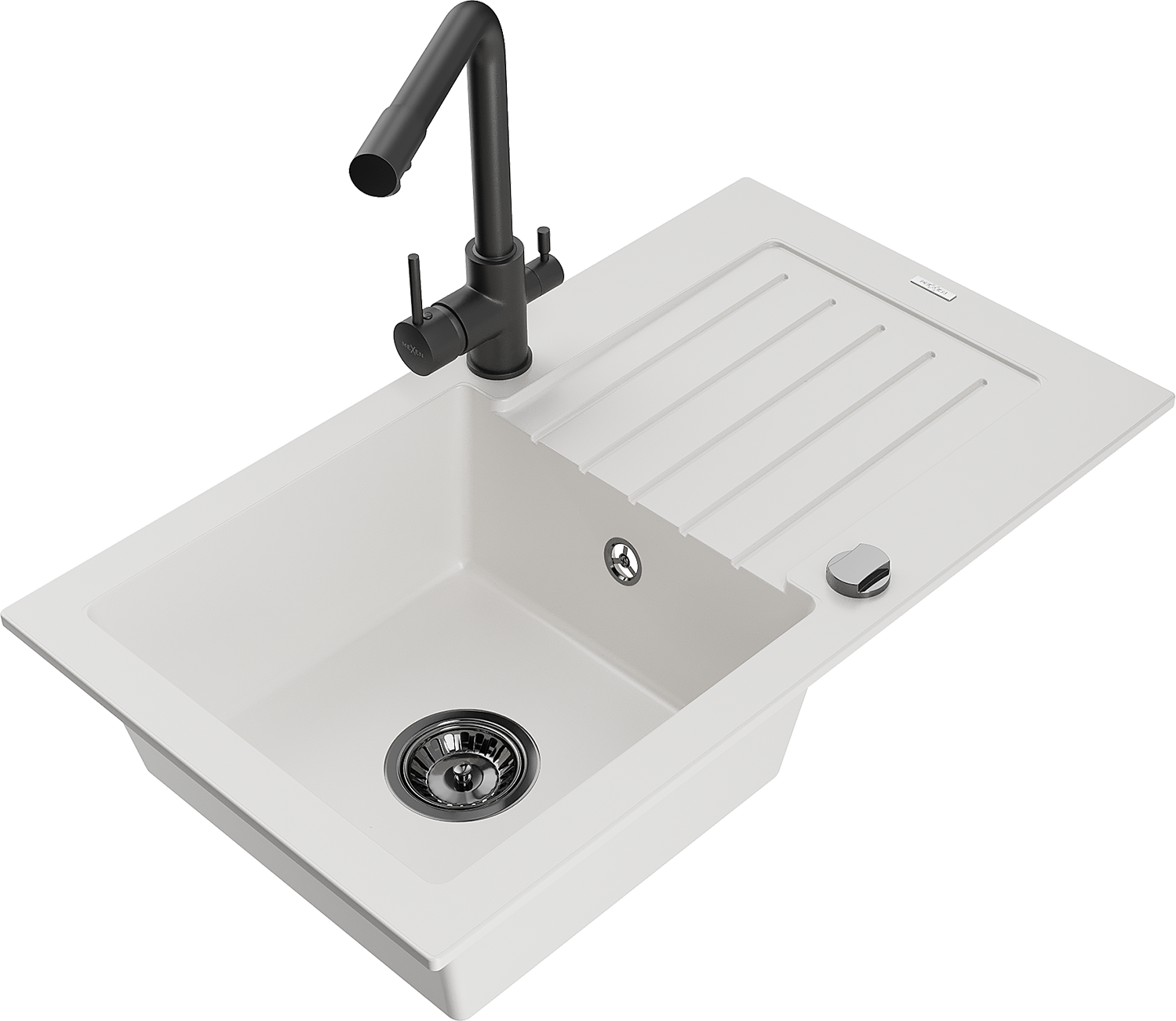 Mexen Pablo lavello da cucina in granito a 1 vasca con sgocciolatoio e rubinetto Duero, bianco - 6510-20-671600-70