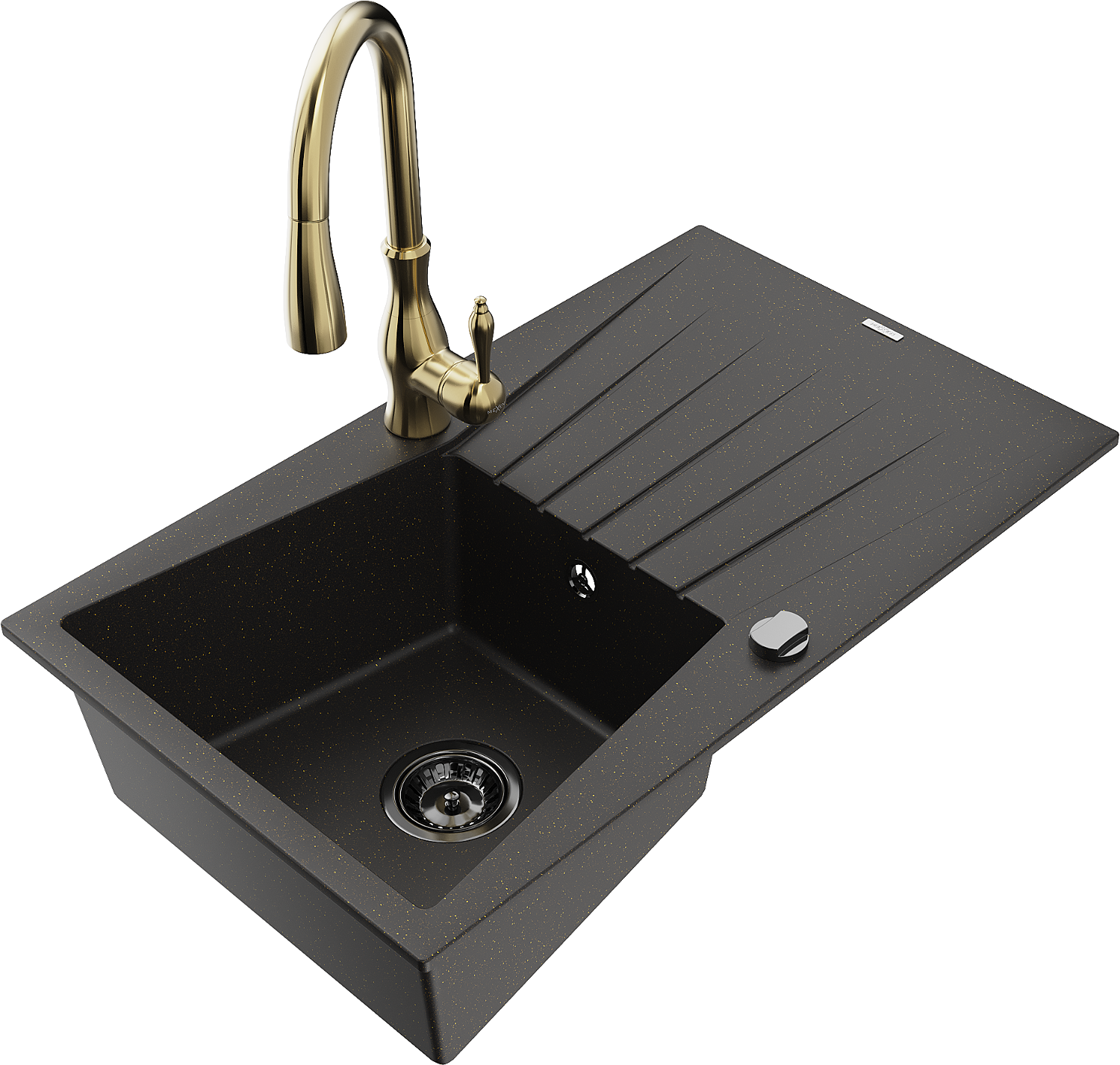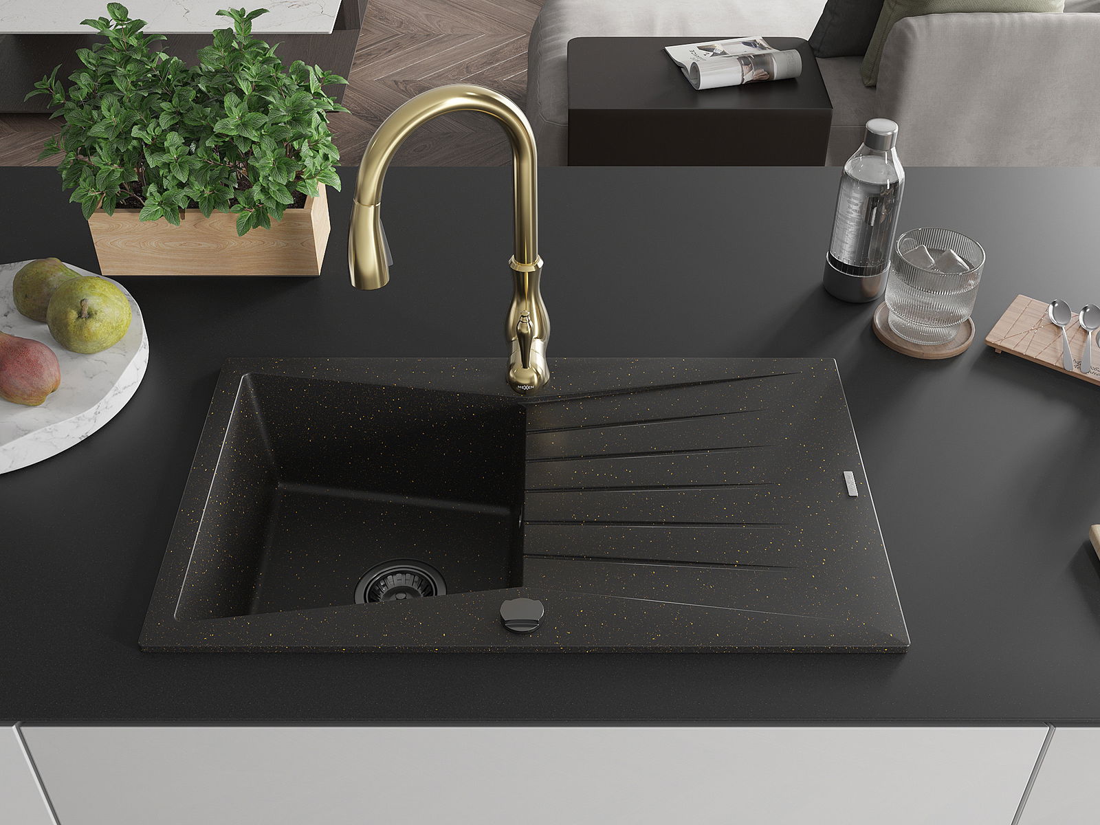 Mexen Cesar lavello in granito a 1 vasca con sgocciolatoio e rubinetto da cucina Savita, nero/oro metallizzato