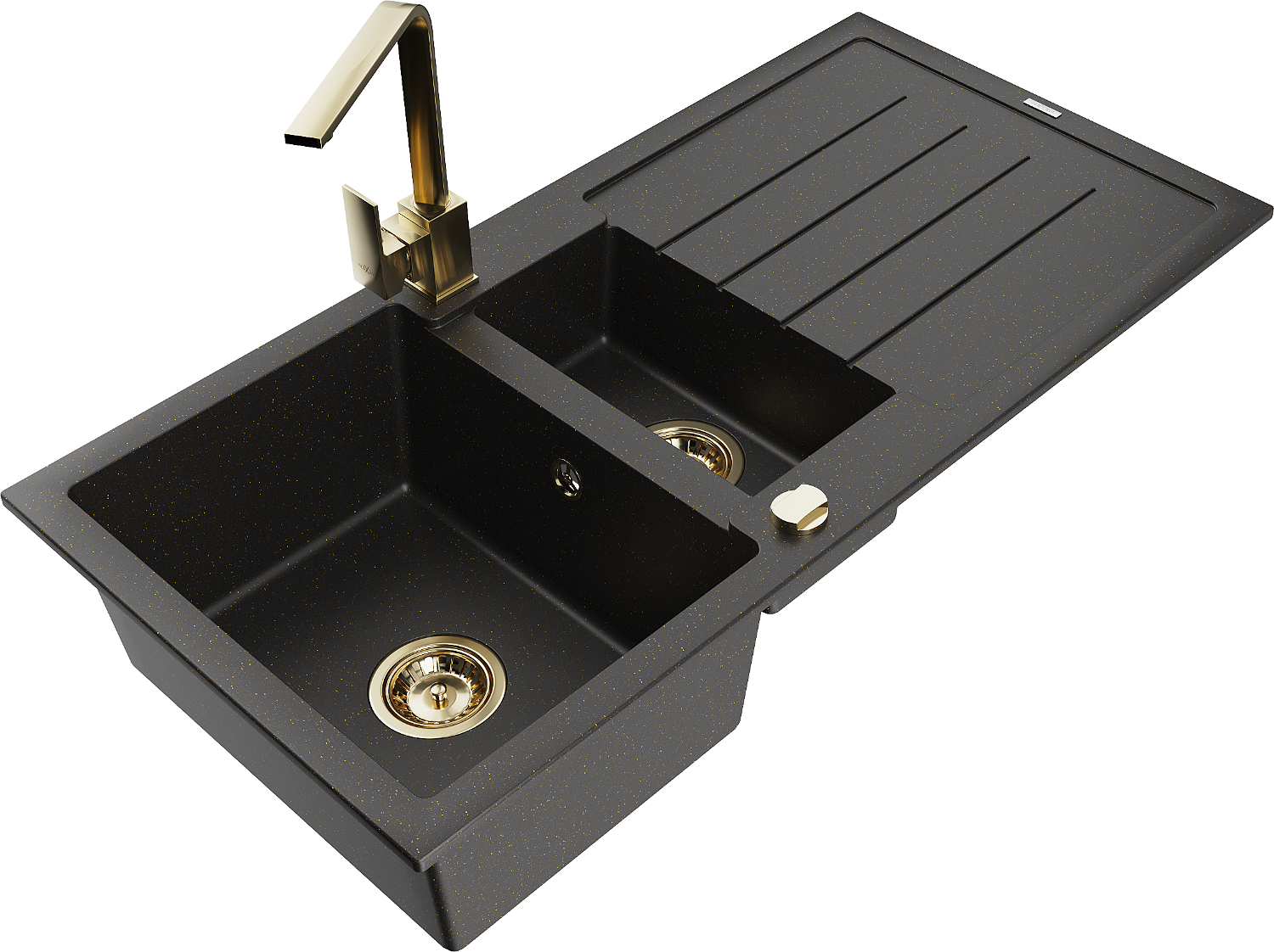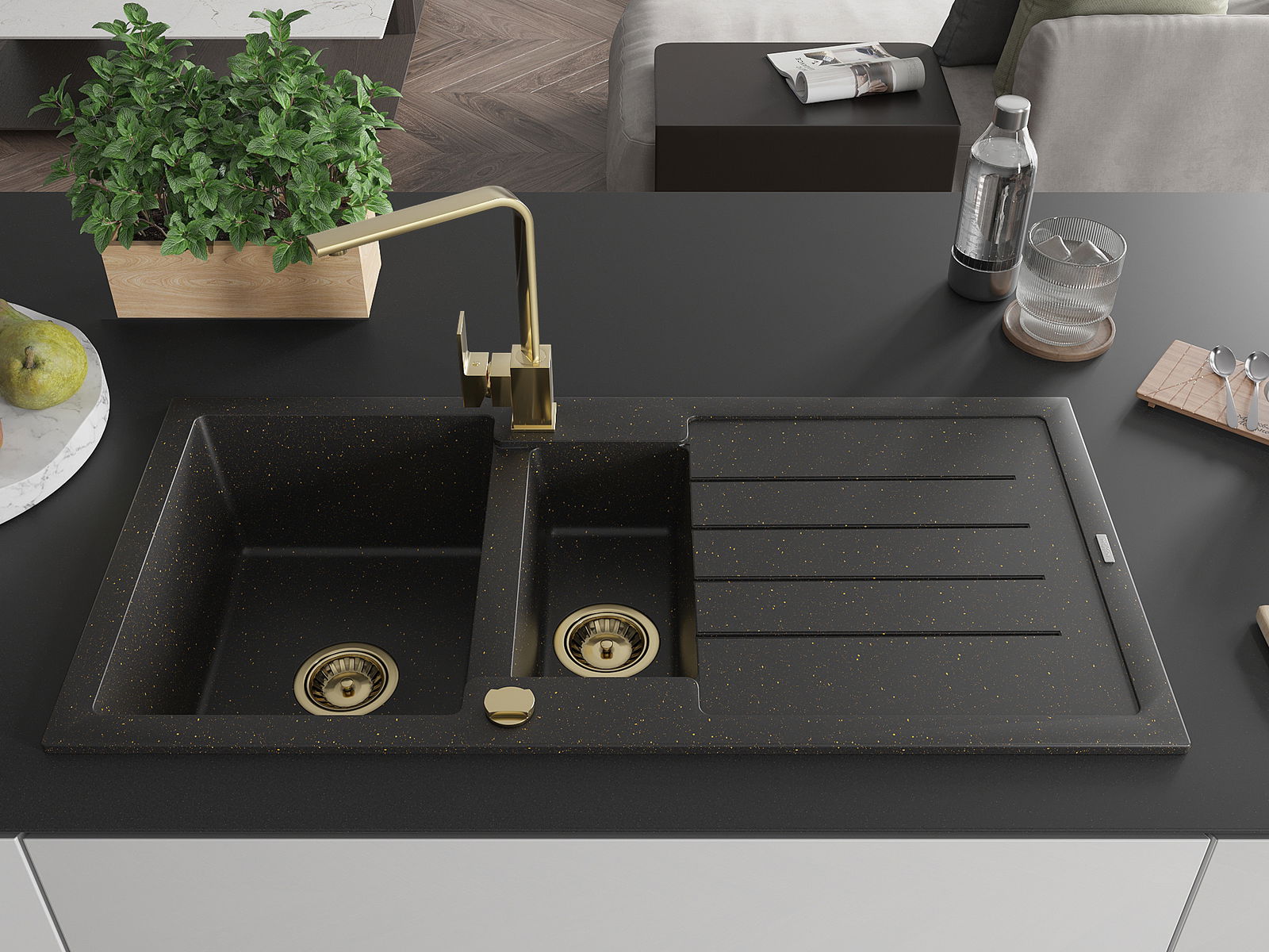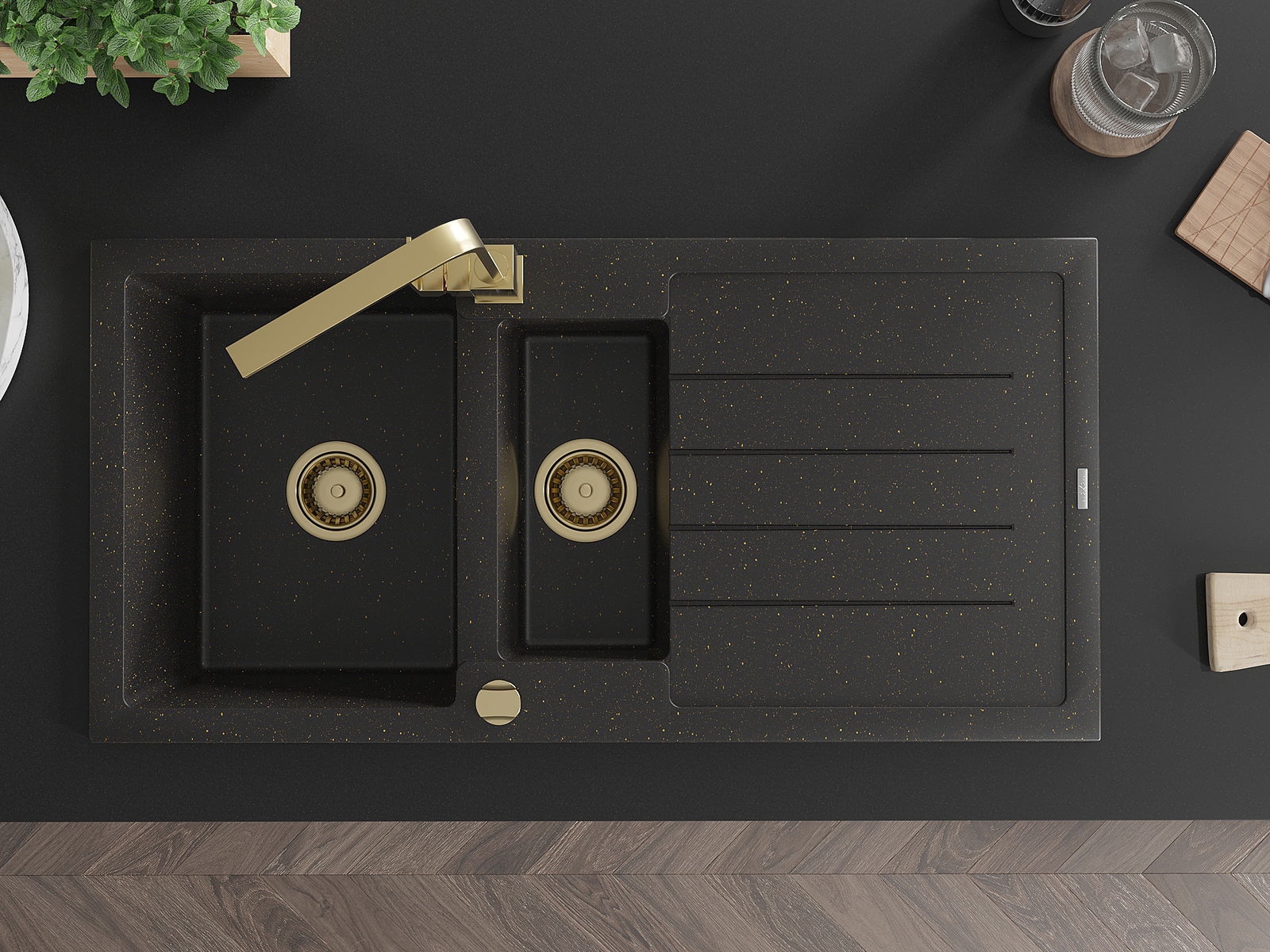 Mexen Andres lavello in granito 1,5 vasche con sgocciolatoio e miscelatore da cucina Rita, nero/metallizzato oro