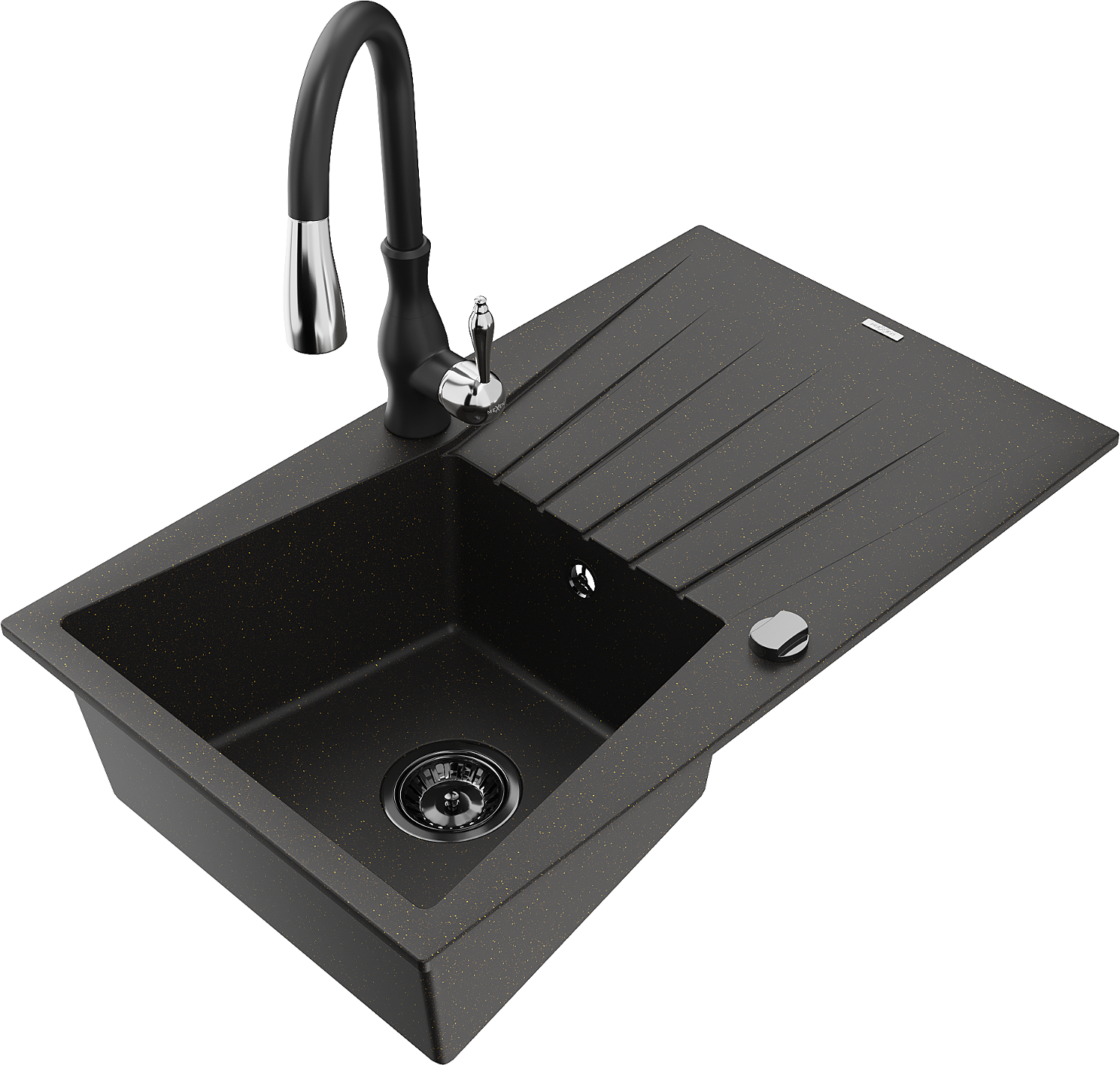 Mexen Cesar lavello in granito a 1 vasca con sgocciolatoio e rubinetto da cucina Savita, nero/oro metallizzato