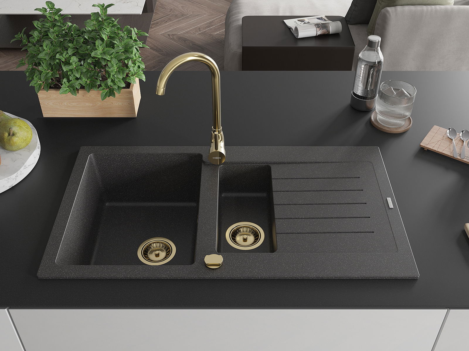 Mexen Matias lavello in granito 1,5 vasche con scolapiatti e rubinetto da cucina Telma, nero maculato - 6502-76-670200-50