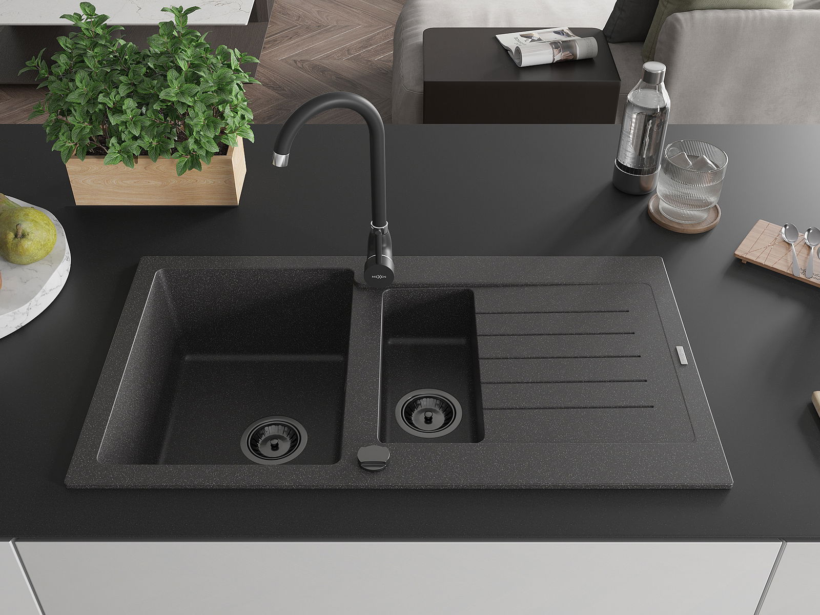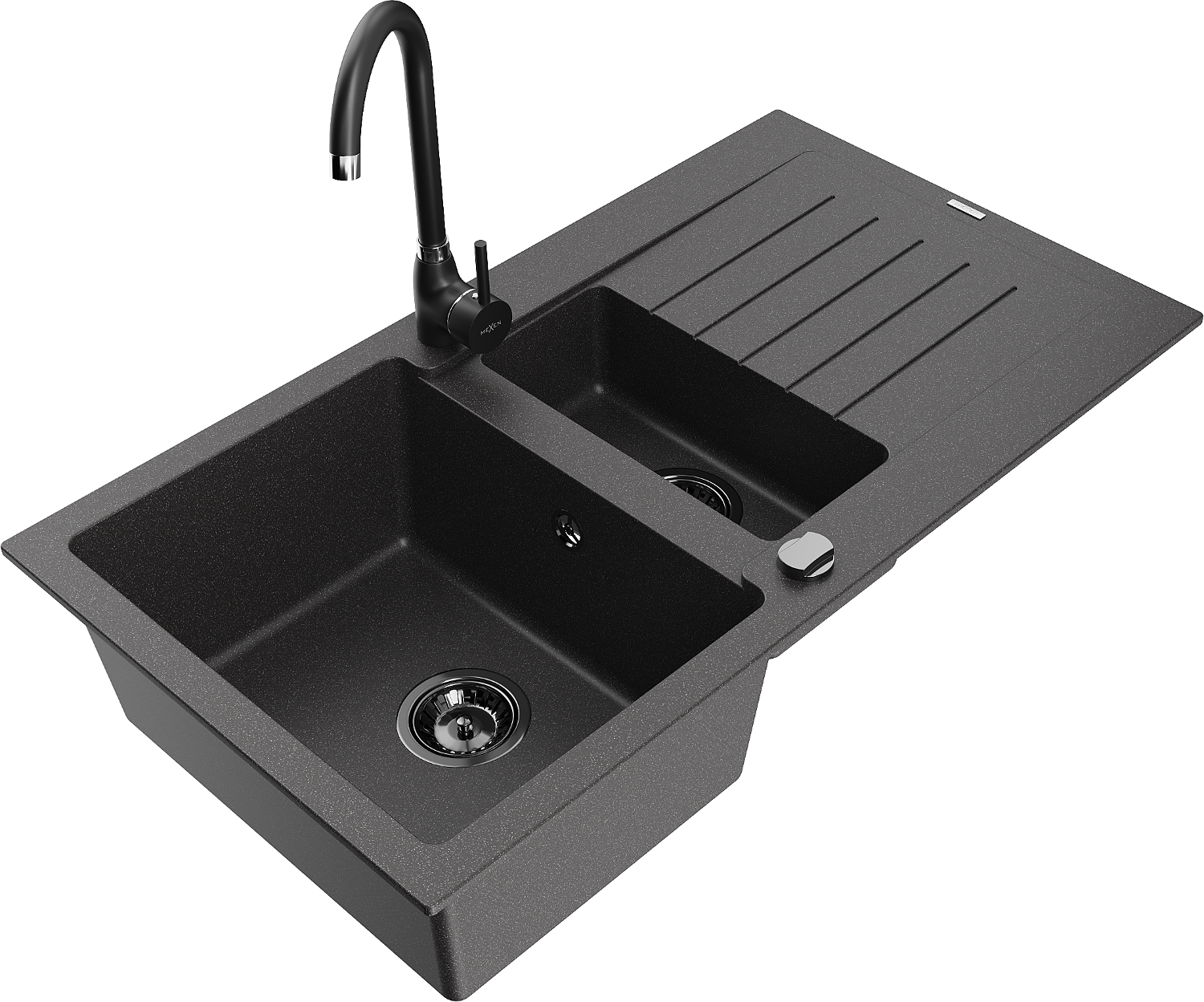 Mexen Matias lavello in granito 1,5 vasche con scolapiatti e rubinetto da cucina Telma, nero punteggiato - 6502-76-670200-70-B