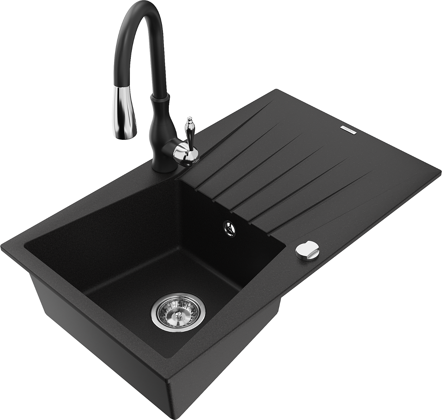 Mexen Cesar lavello in granito a una vasca con scolapiatti e rubinetto da cucina Savita, nero - 6514-77-672601-70