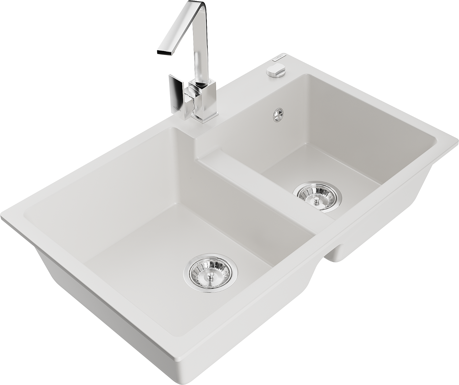 Mexen Tomas lavello da cucina in granito a 2 vasche con miscelatore da cucina Rita, bianco - 6516-20-670300-00