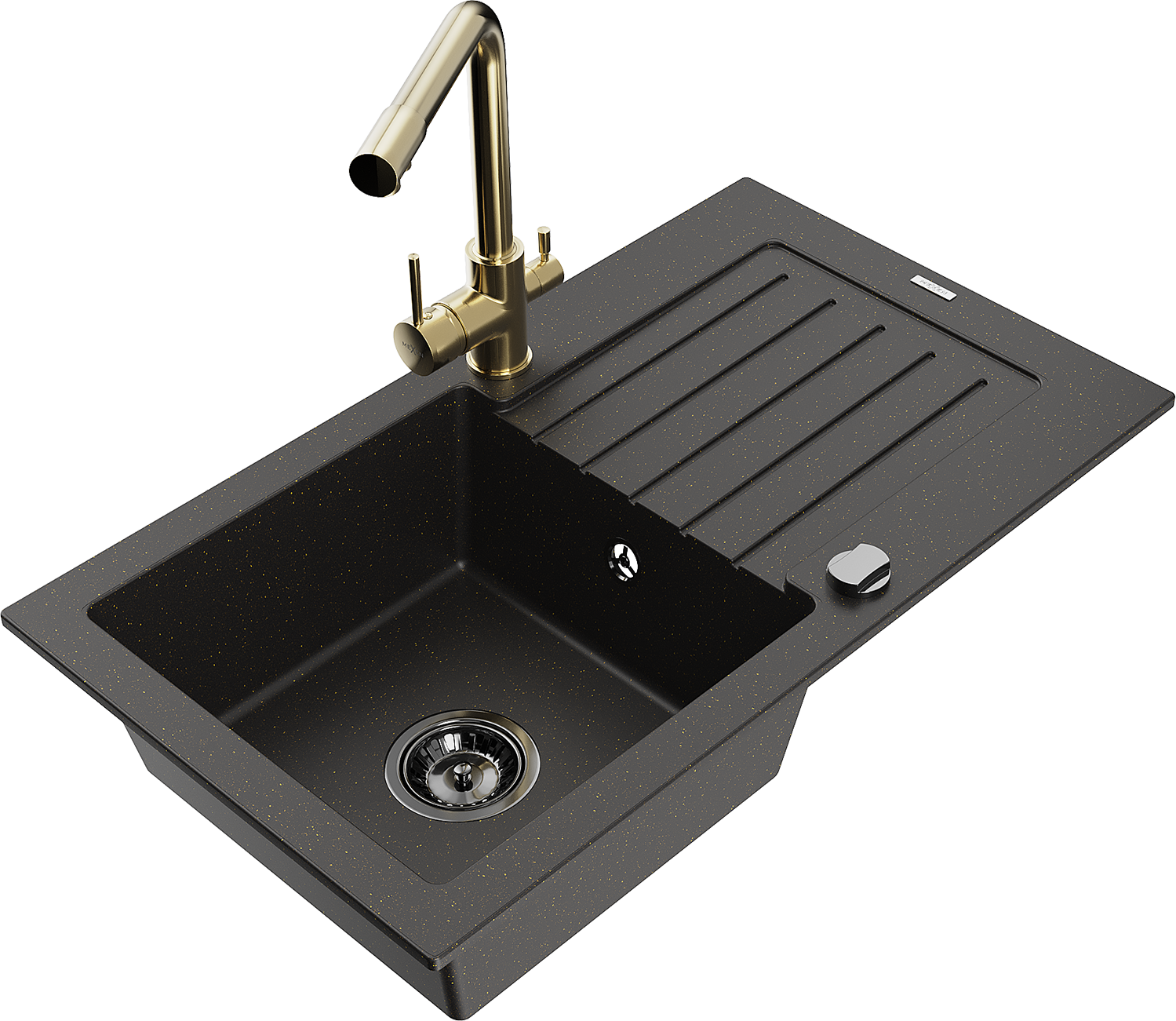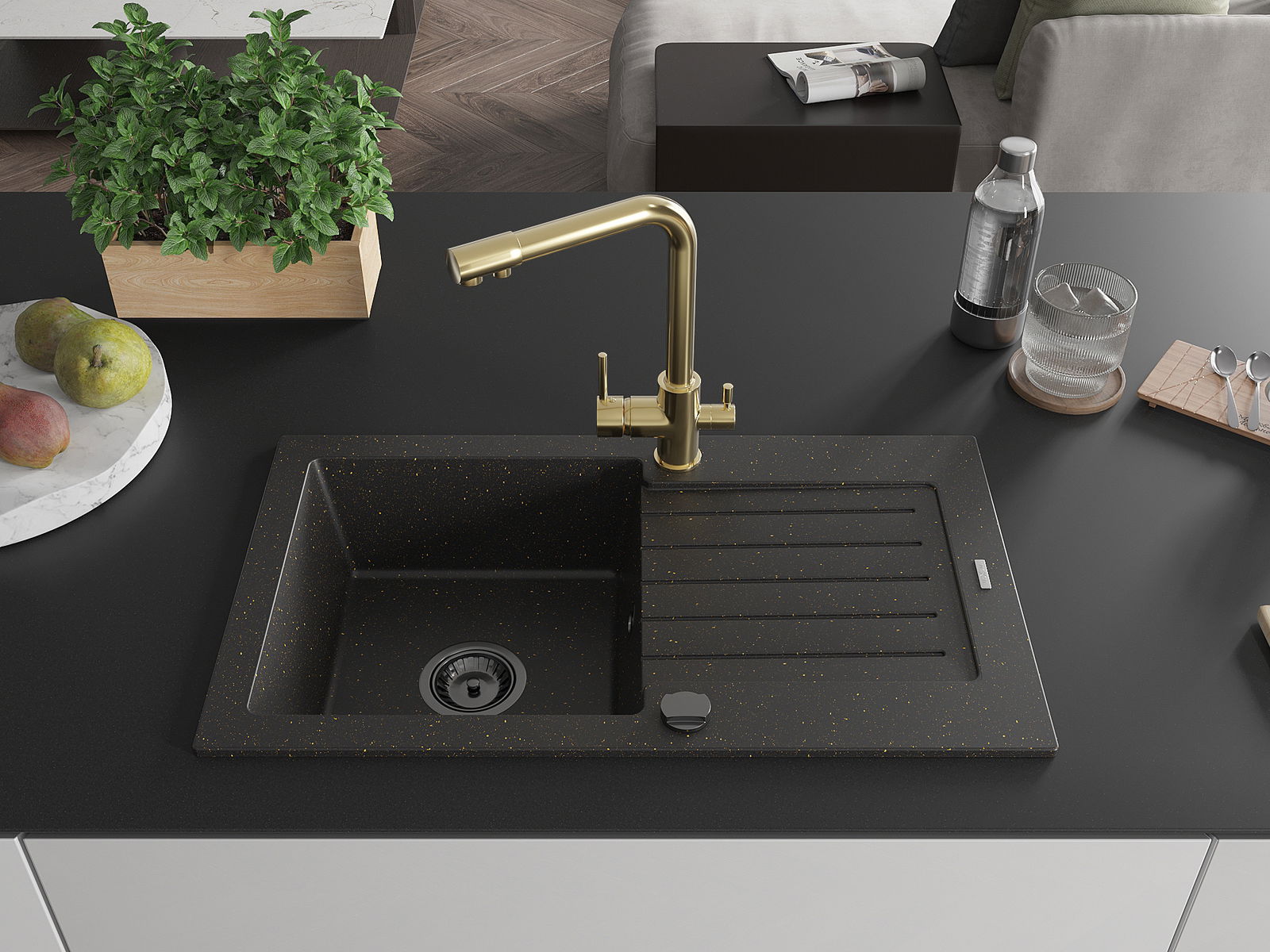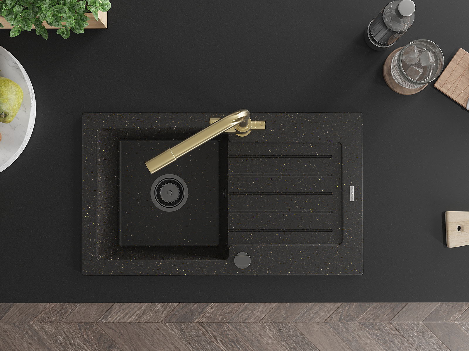 Mexen Pablo lavello in granito a 1 vasca con scolapiatti e rubinetto da cucina Duero, nero/oro metallizzato