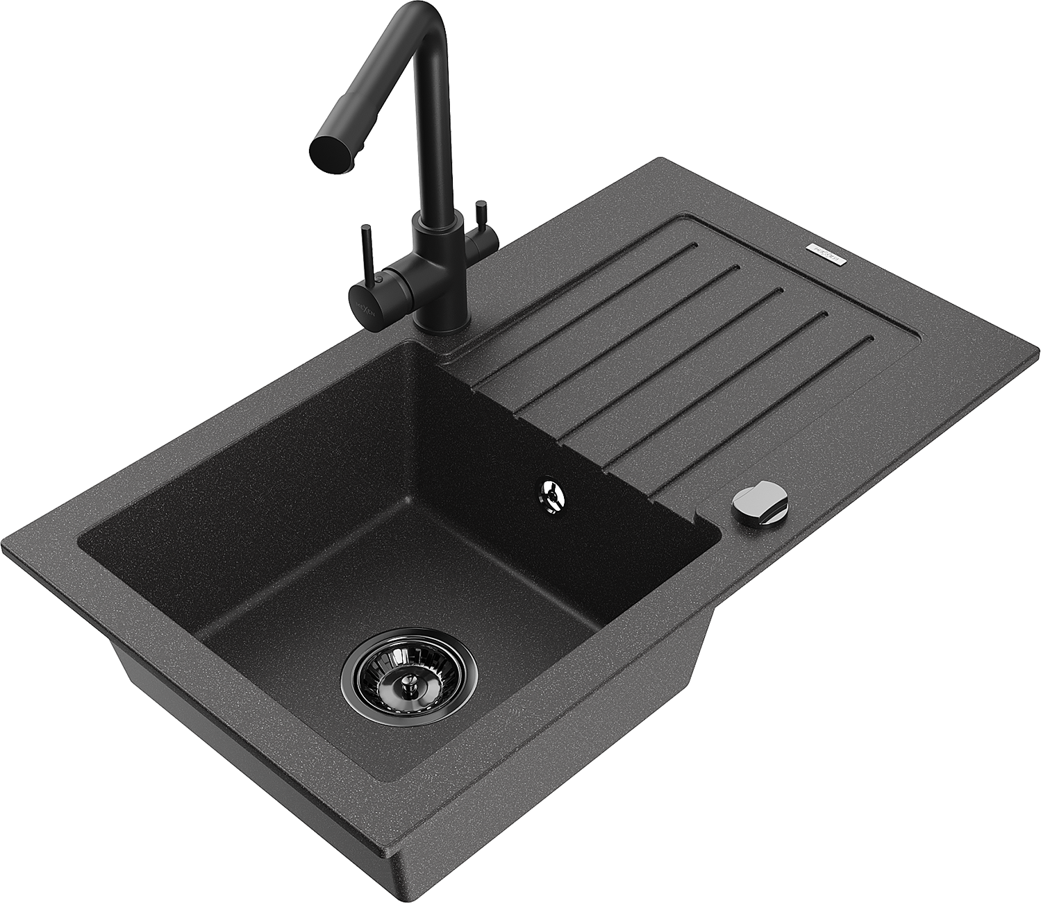 Mexen Pablo lavello in granito a 1 vasca con scolapiatti e rubinetto da cucina Duero, nero maculato - 6510-76-671600-70-B