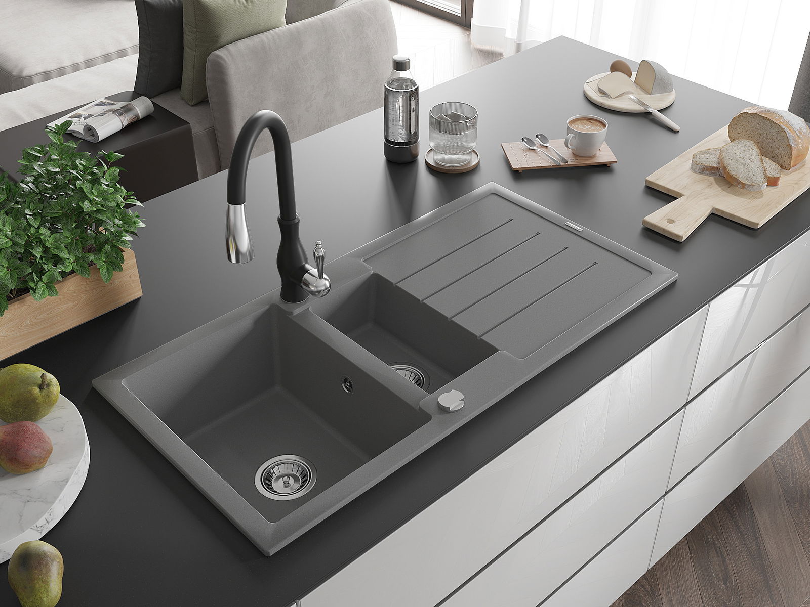 La scelta di un lavello con sgocciolatoio è una soluzione pratica che consente di riporre piatti, verdure e frutta lavati. Lo sgocciolatoio facilita la cucina quotidiana e aiuta a mantenere l'ordine in cucina.