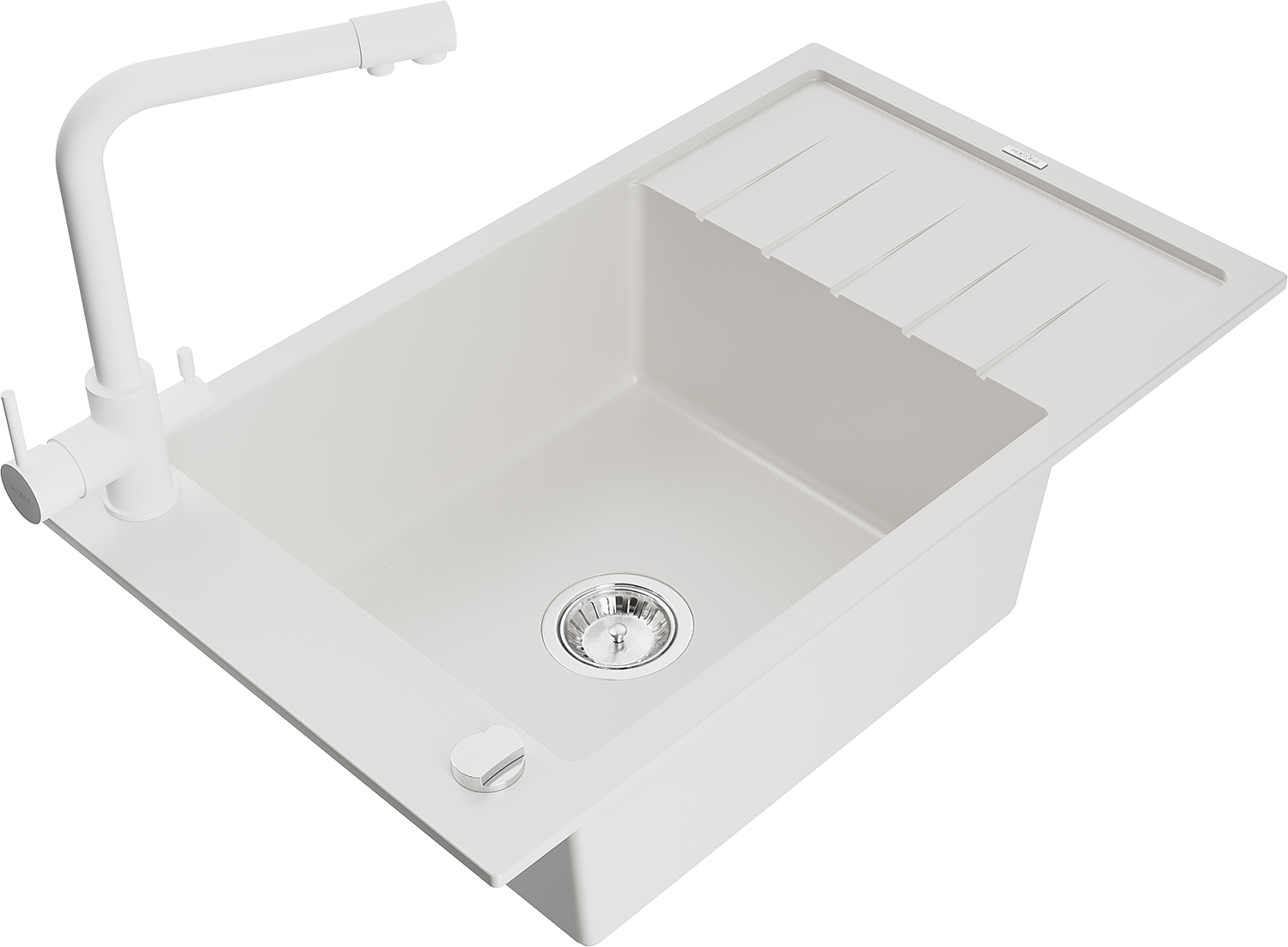 Mexen Elias lavello da cucina in granito, a 1 vasca con sgocciolatoio e miscelatore da cucina Duero, bianco - 6511-20-671600-20