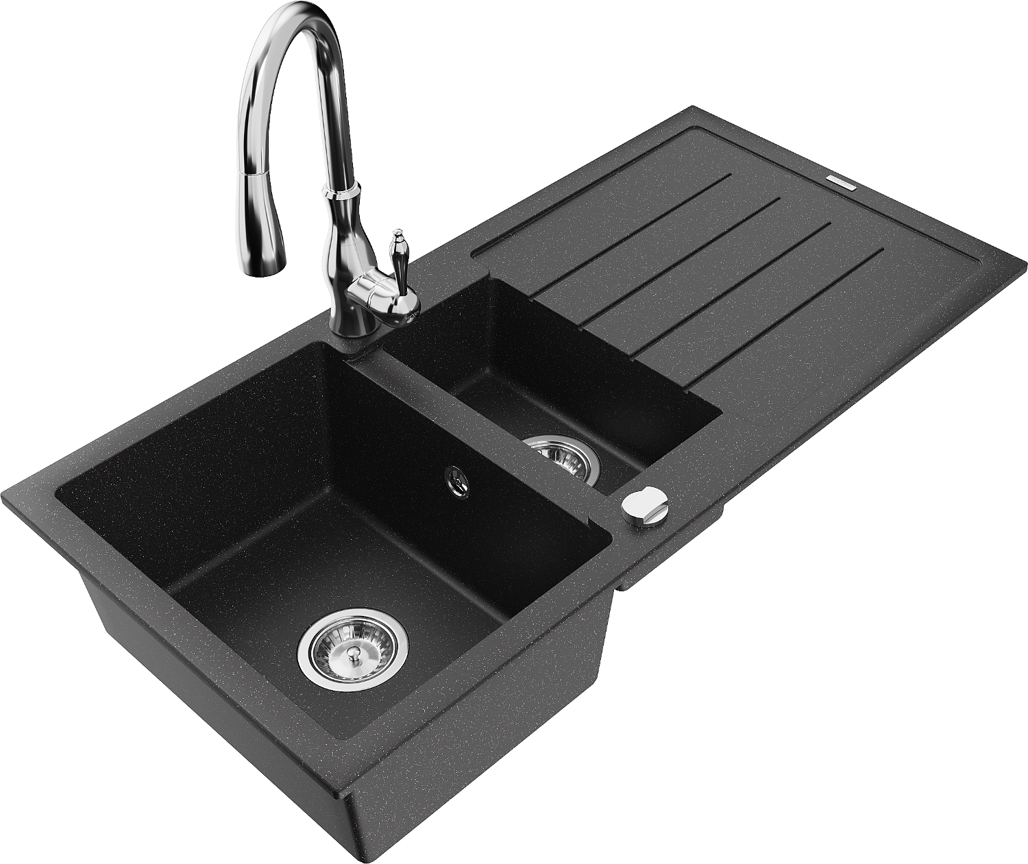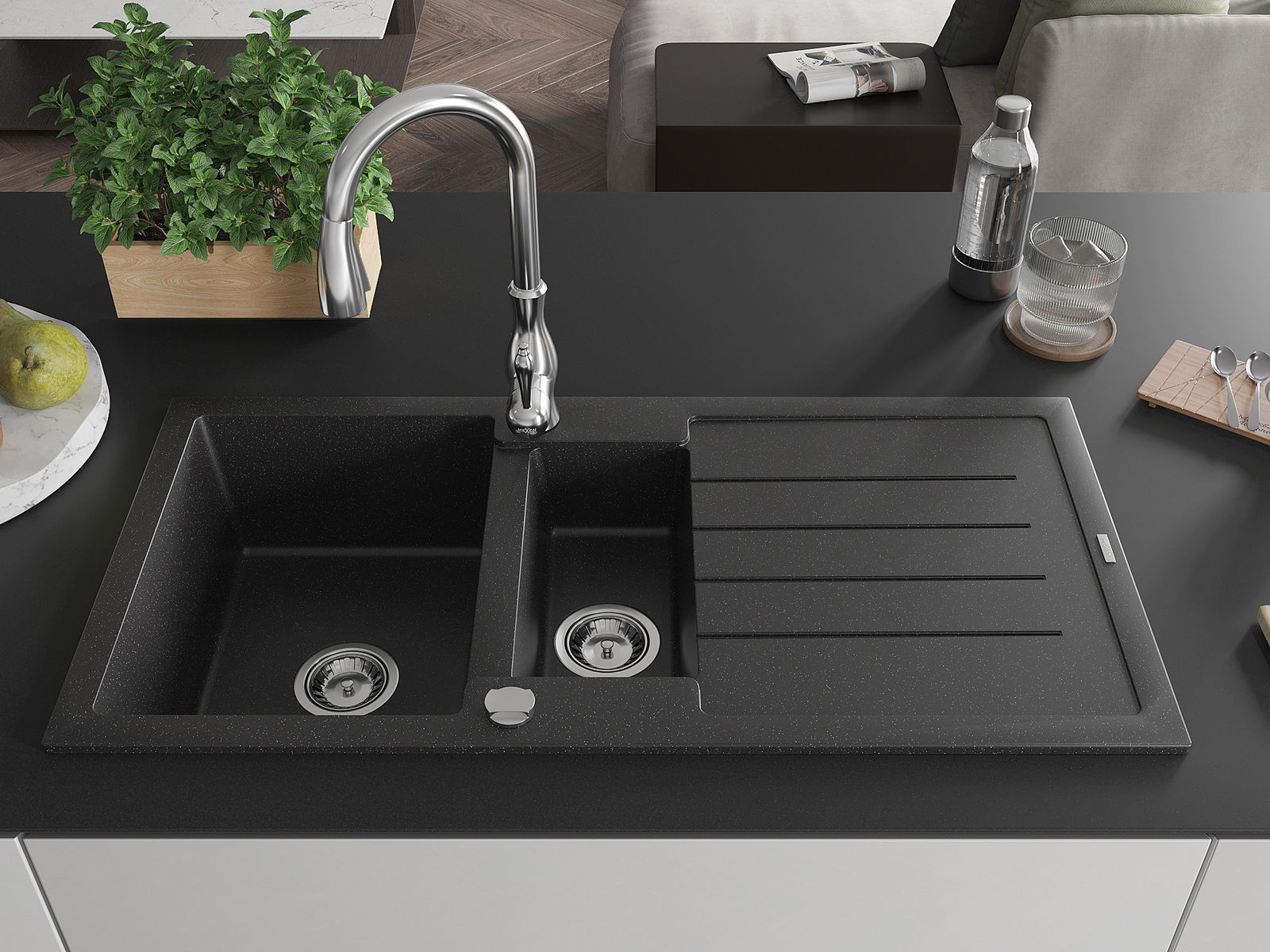 Mexen Andres lavello in granito 1,5 vasche con sgocciolatoio e rubinetto da cucina Savita, nero/argento - 6515-73-672601-00