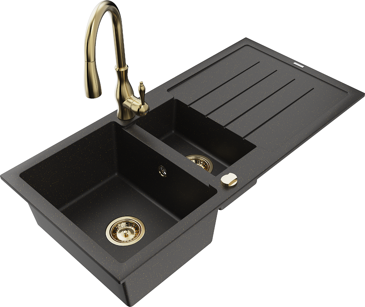 Mexen Andres lavello in granito 1,5 vasca con scolapiatti e rubinetto da cucina Savita, nero/oro metallic - 6515-75-672601-50