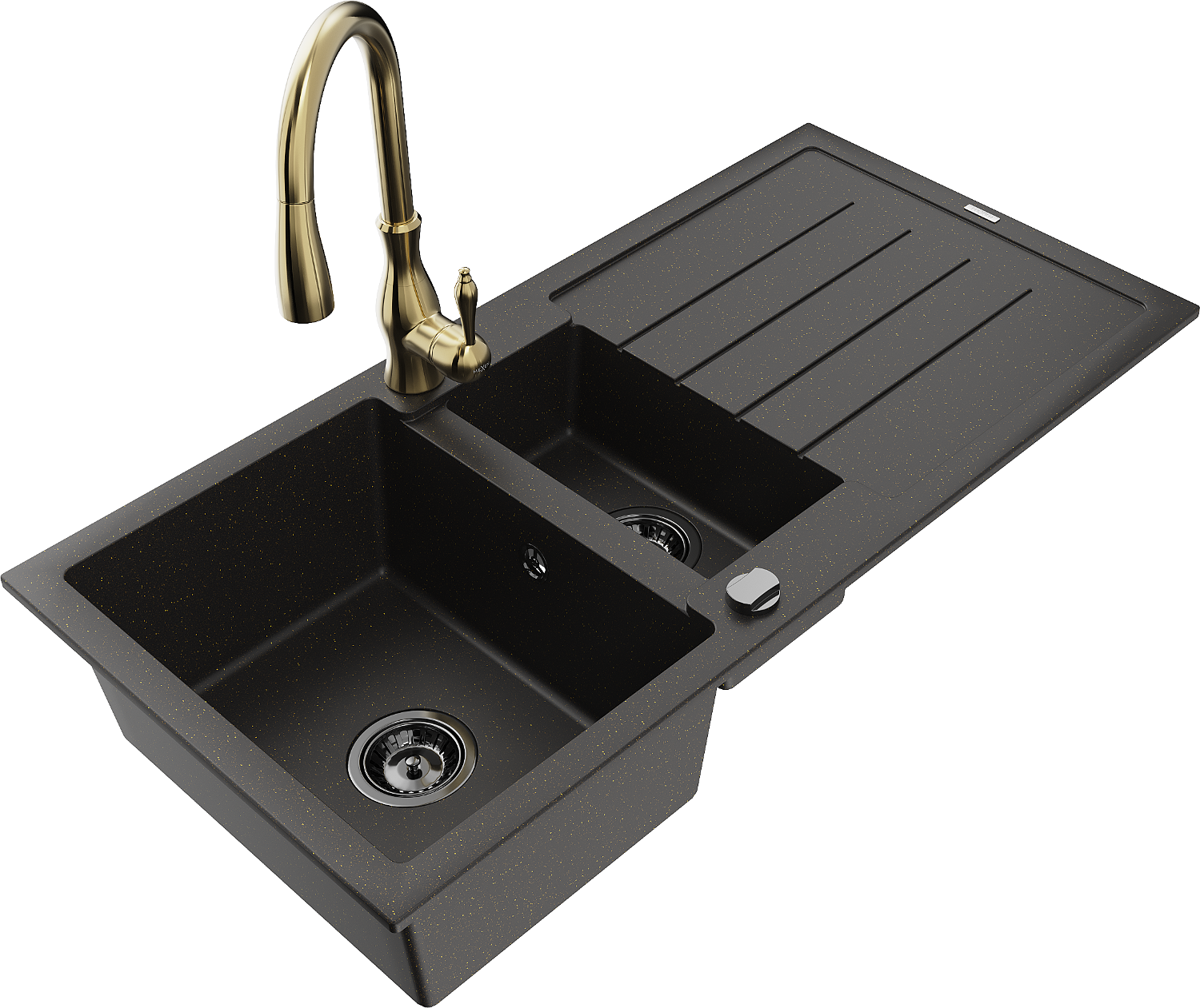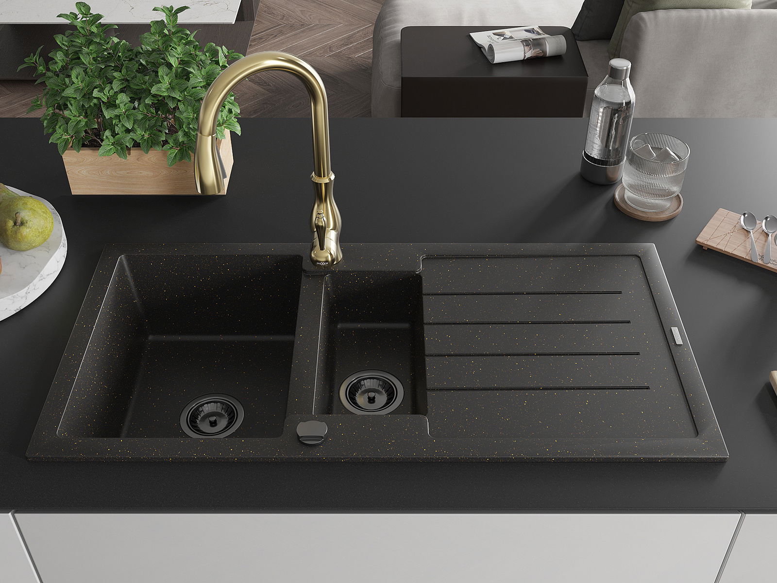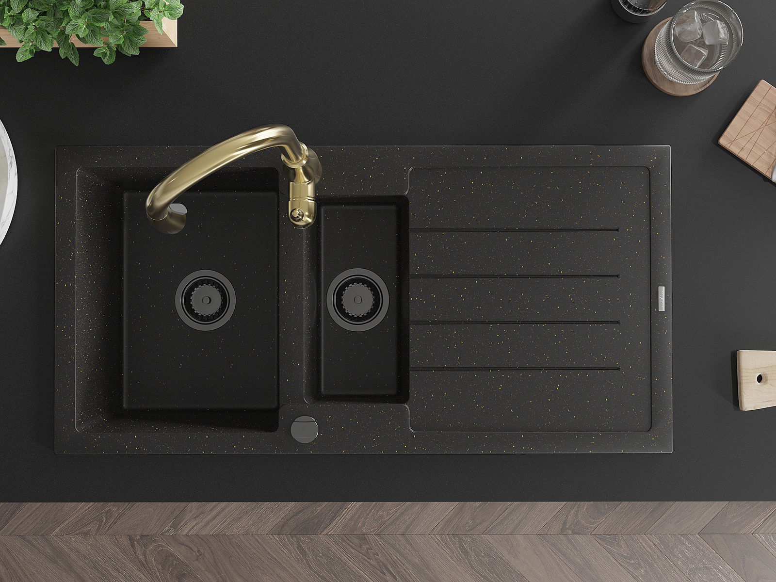 Mexen Andres lavello in granito a 1,5 vasche con sgocciolatoio e rubinetto da cucina Savita, nero/oro - 6515-75-672601-50-B