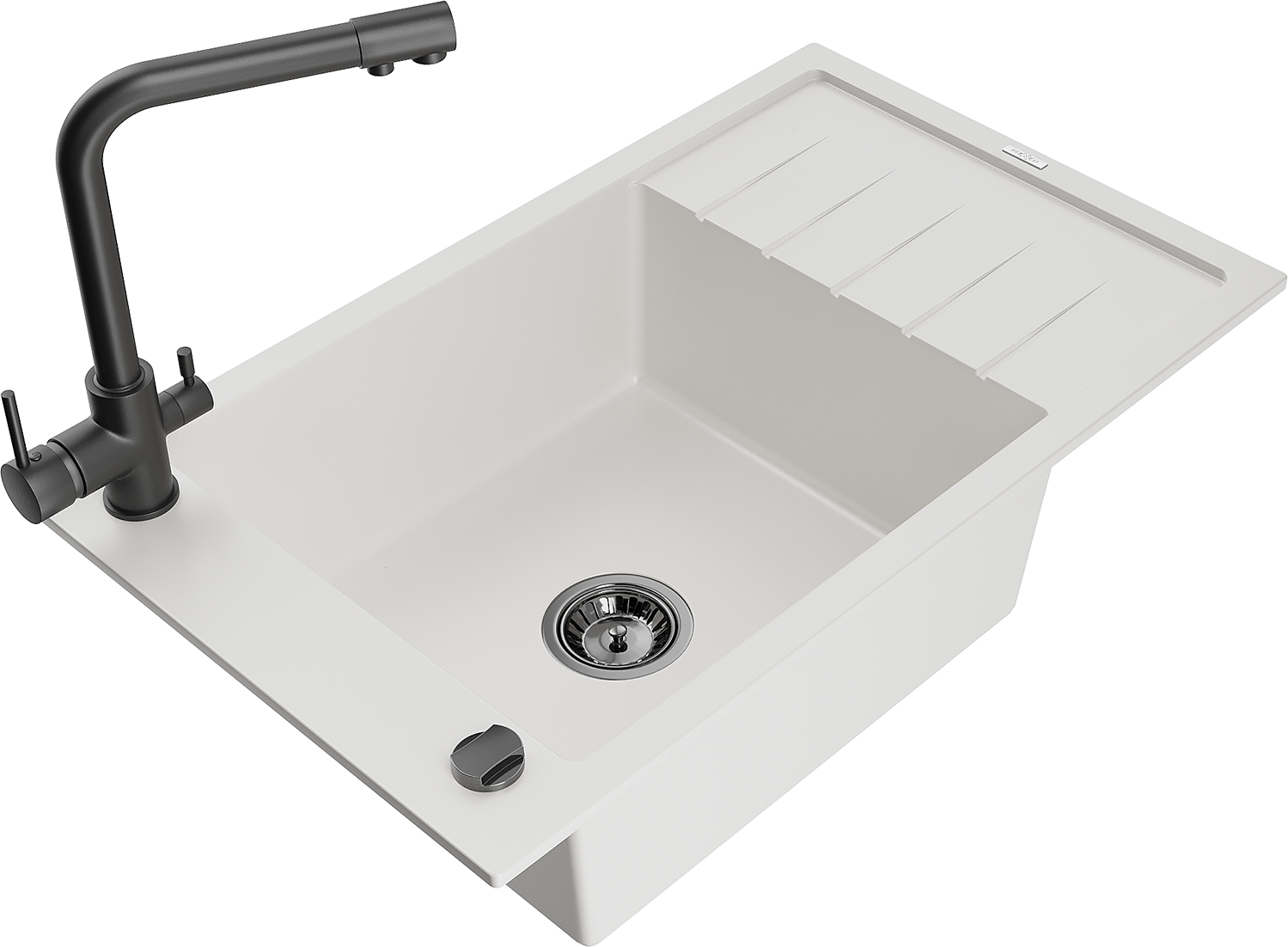 Mexen Elias lavello da cucina in granito 1-vasca con sgocciolatoio e rubinetto da cucina Duero, bianco - 6511-20-671600-70