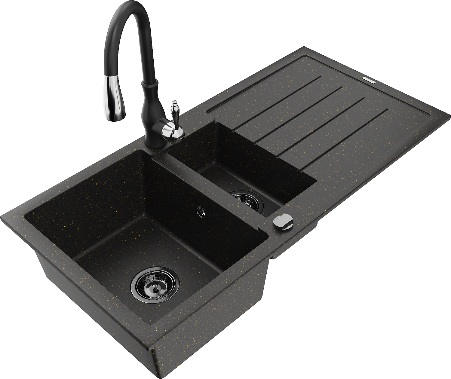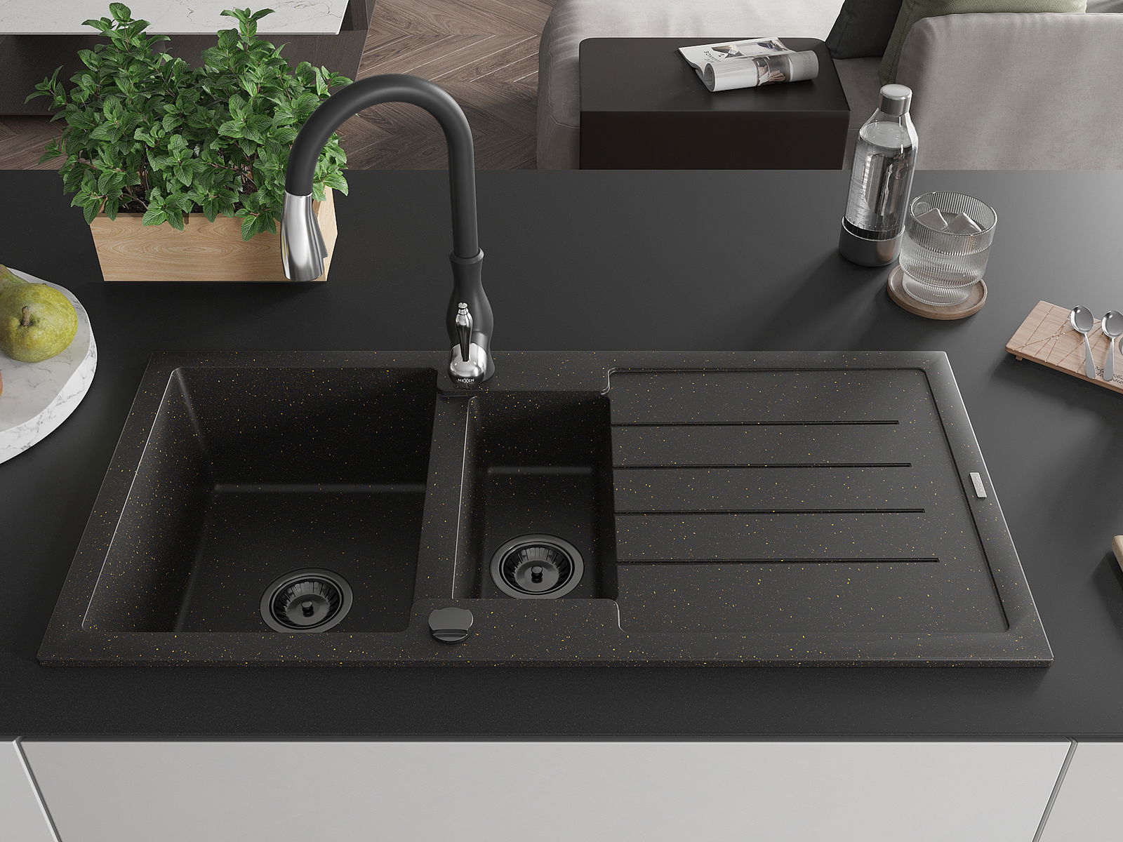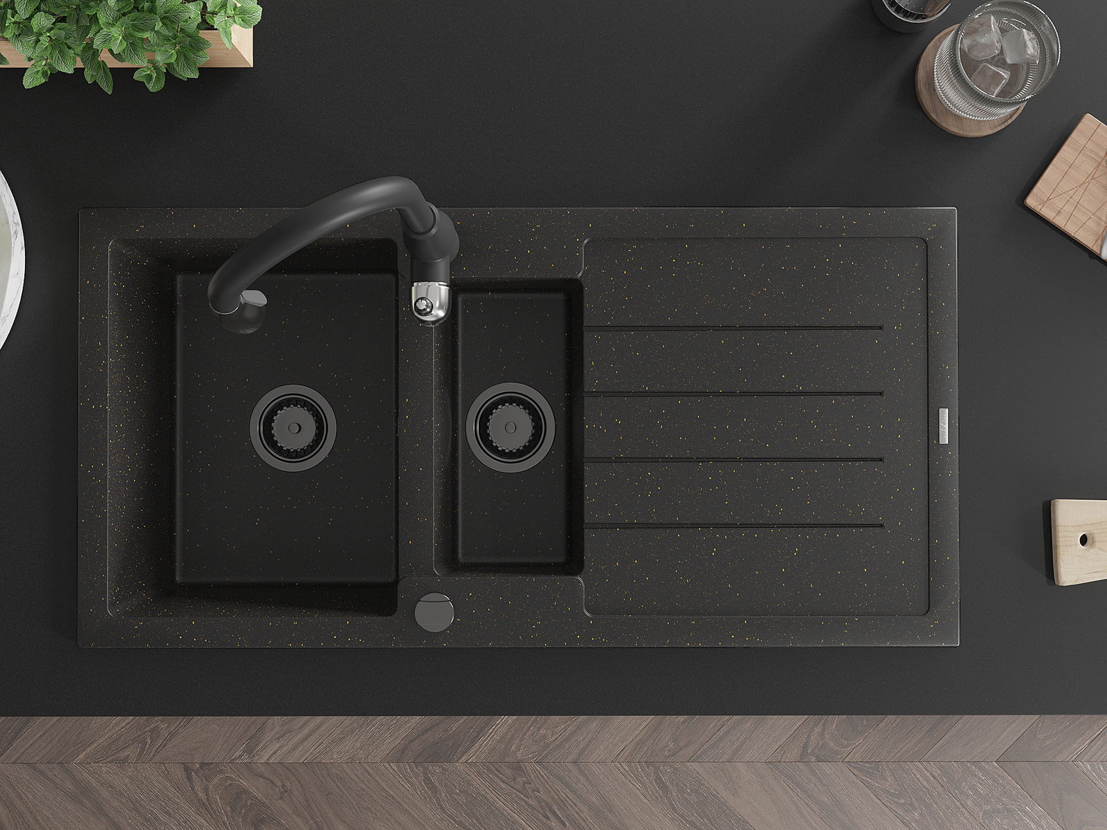 Mexen Andres lavello in granito 1,5 camere con sgocciolatoio e miscelatore da cucina Savita, nero/oro - 6515-75-672601-70-B
