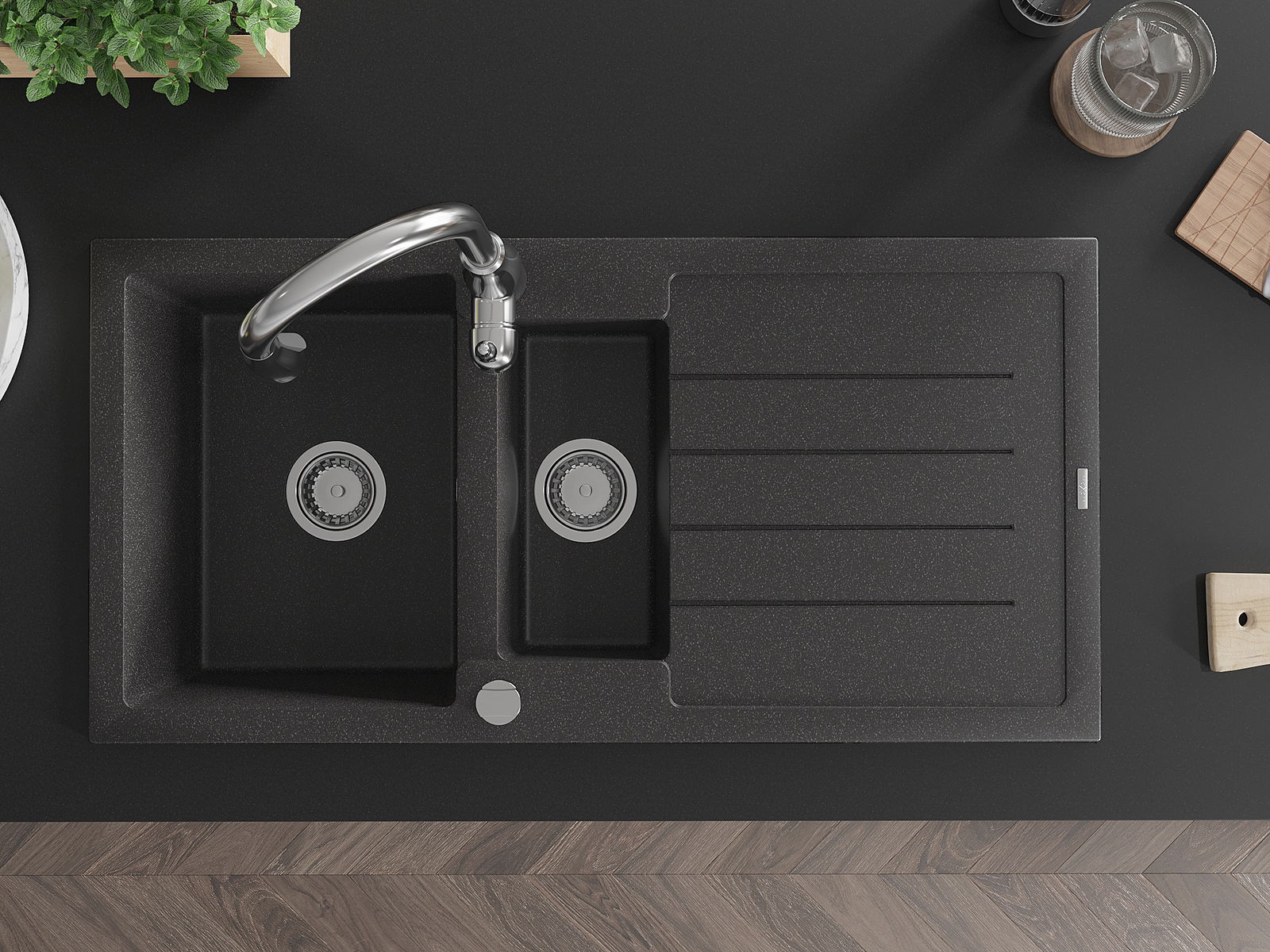 Mexen Andres lavello in granito 1,5 vasca con scolapiatti e miscelatore da cucina Savita, nero maculato - 6515-76-672601-00