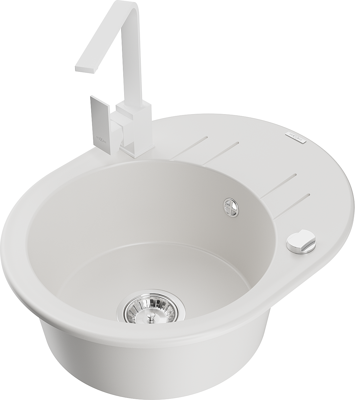 Mexen Kevin lavello in granito 1-vasca con sgocciolatoio e rubinetto cucina Rita, bianco - 6517-20-670300-20