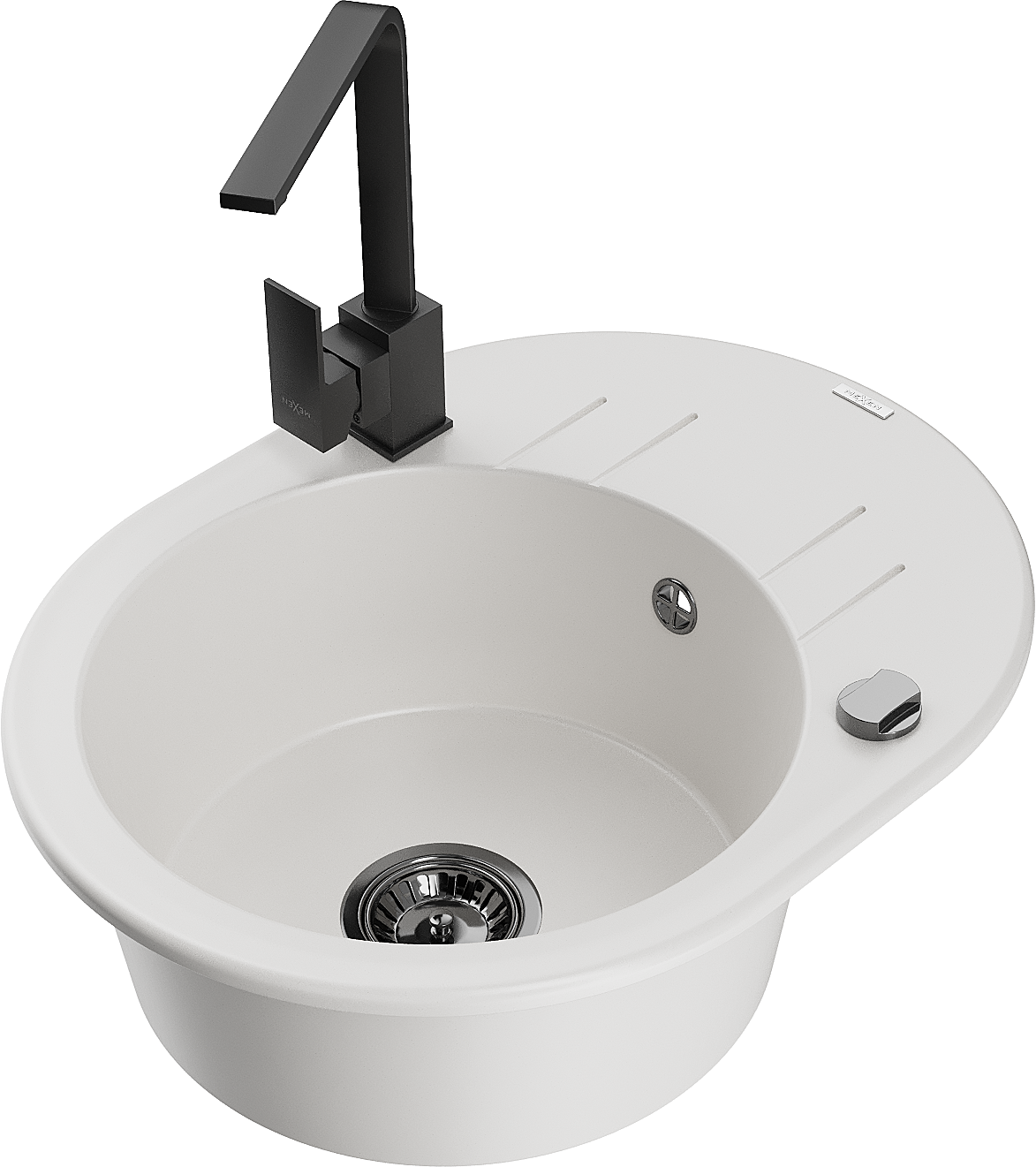 Mexen Kevin lavello in granito 1-vasca con scolapiatti e rubinetto da cucina Rita, bianco - 6517-20-670300-70