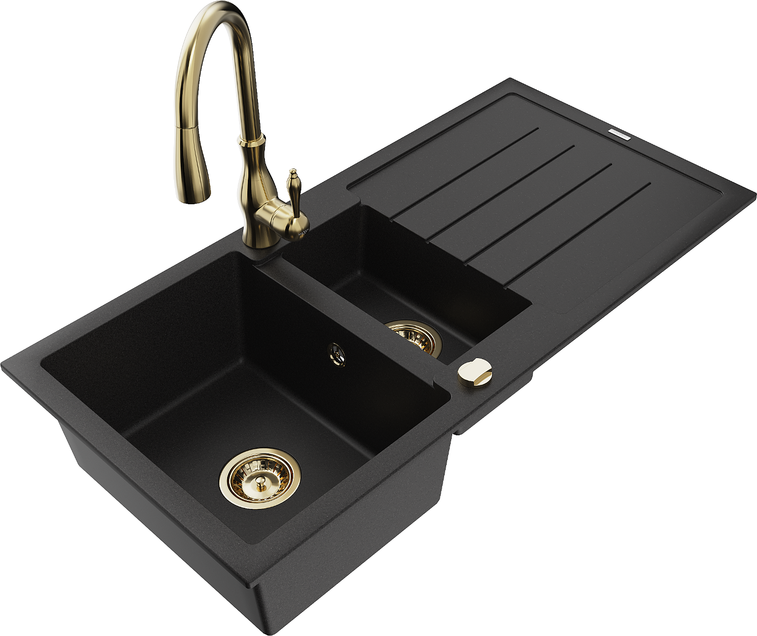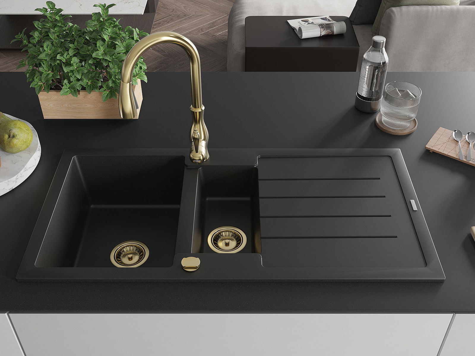 Mexen Andres lavello in granito 1,5 vasche con sgocciolatoio e miscelatore cucina Savita, nero - 6515-77-672601-50