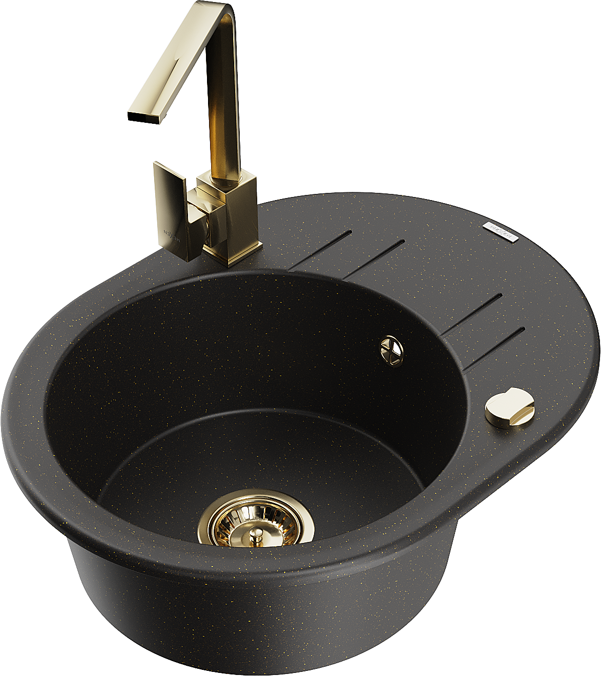 Mexen Kevin lavello in granito a 1 vasca con scolapiatti e rubinetto da cucina Rita, nero/oro metallizzato - 6517-75-670300-50