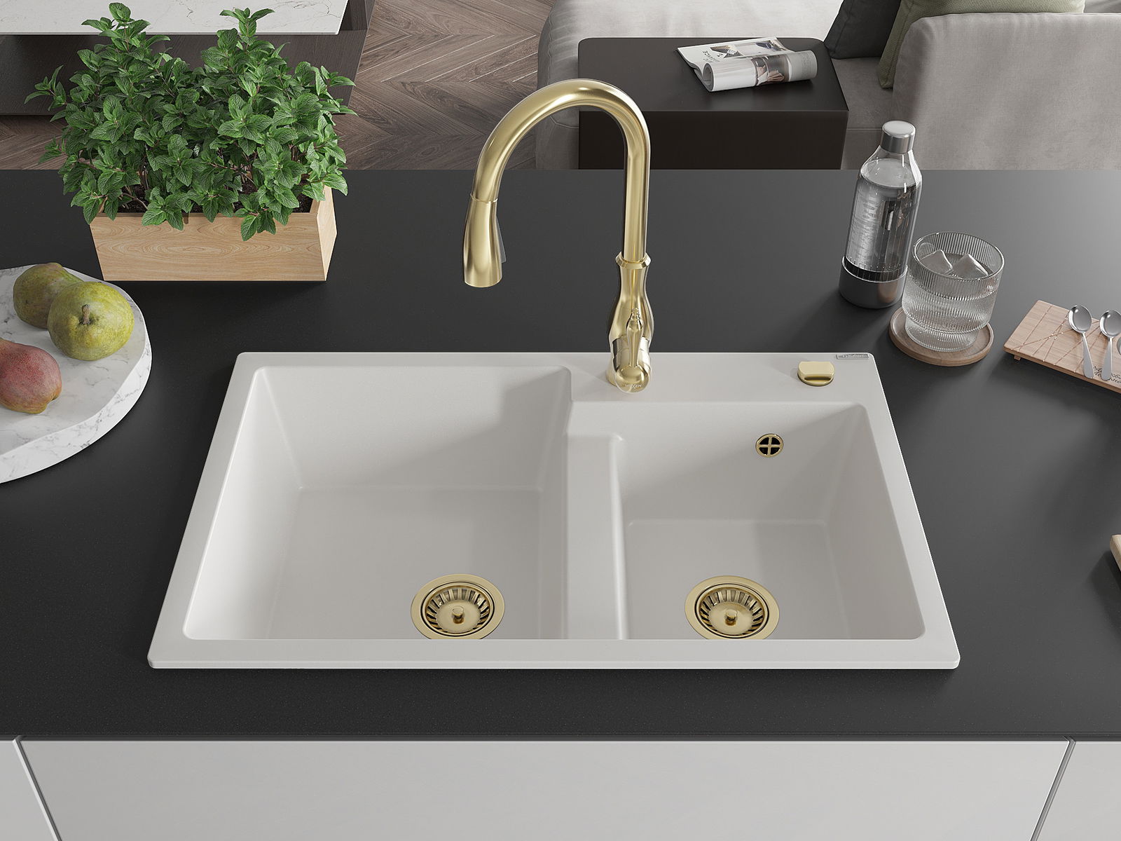 Mexen Tomas lavello in granito a 2 vasche con rubinetto da cucina Savita, bianco - 6516-20-672601-50