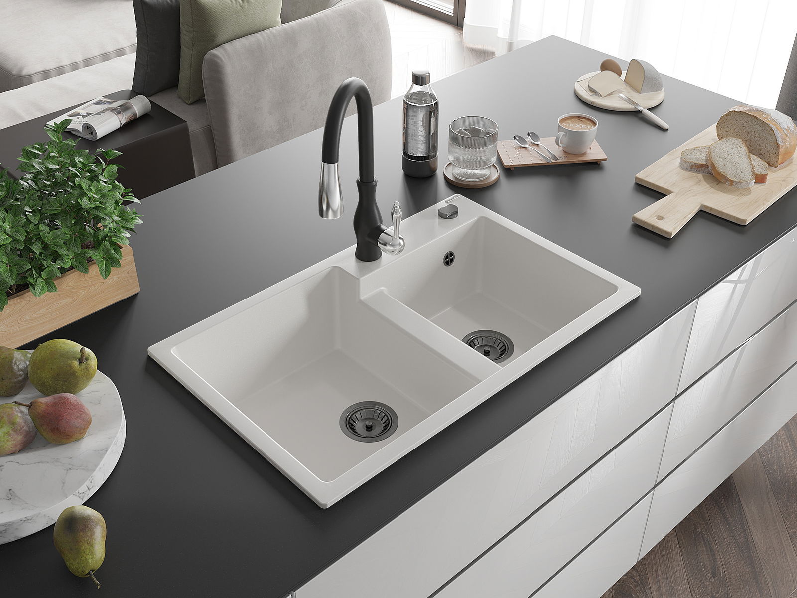 Mexen Tomas lavello da cucina in granito a 2 vasche con rubinetto da cucina Savita, bianco - 6516-20-672601-70