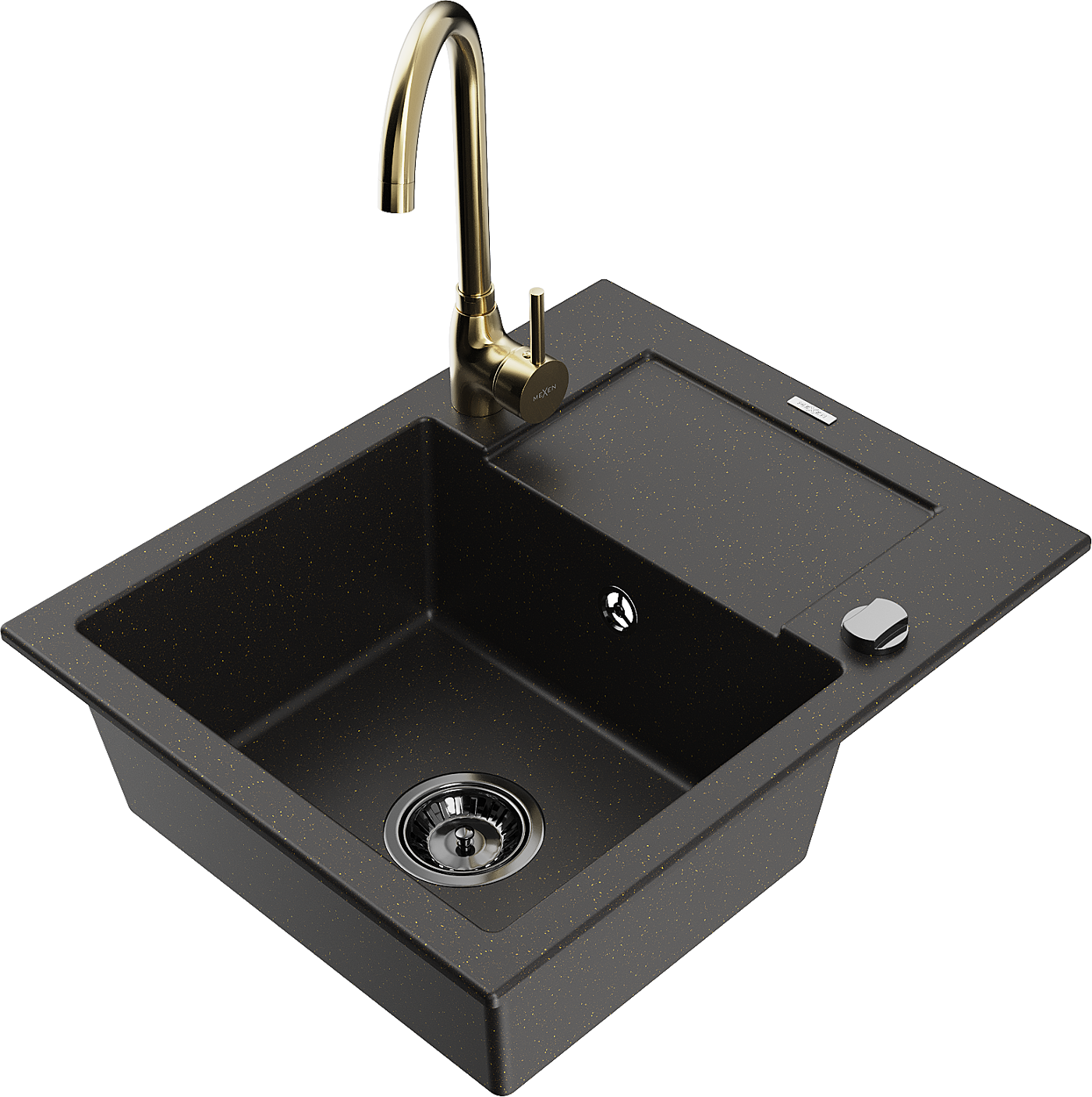 Mexen Enzo lavello in granito a 1 vasca con gocciolatoio e rubinetto cucina Telma, nero/oro - 6506-75-670200-50-B