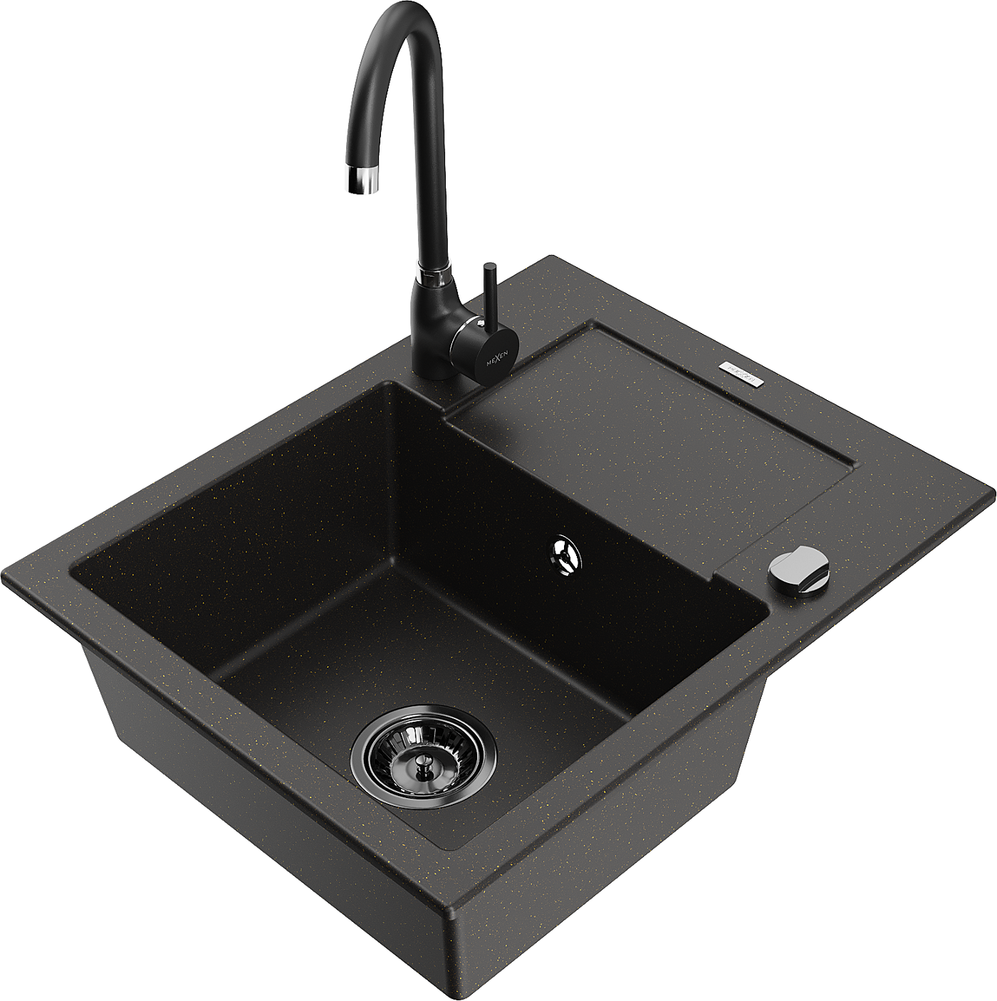 Mexen Enzo lavello in granito 1-vasca con sgocciolatoio e rubinetto da cucina Telma, nero/oro - 6506-75-670200-70-B