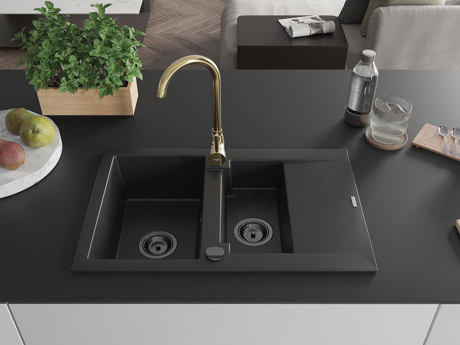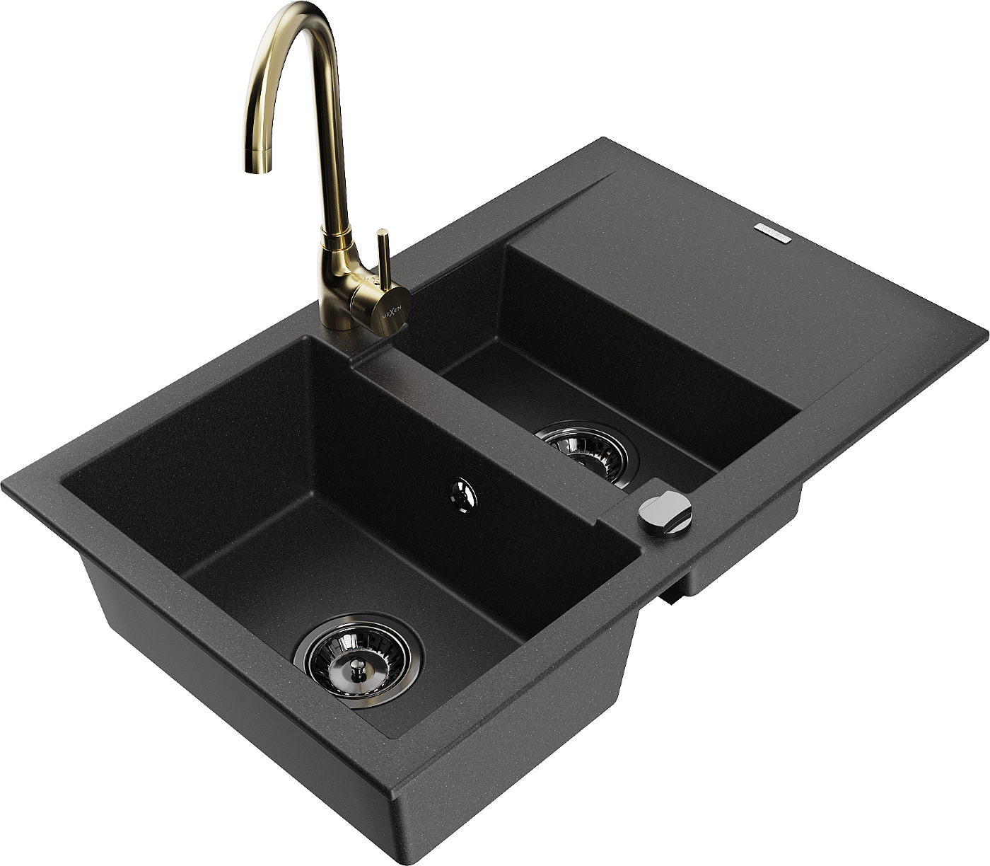 Mexen Gaspar lavello in granito 1,5 vasche con scolapiatti e rubinetto da cucina Telma, nero - 6507-77-670200-50-B