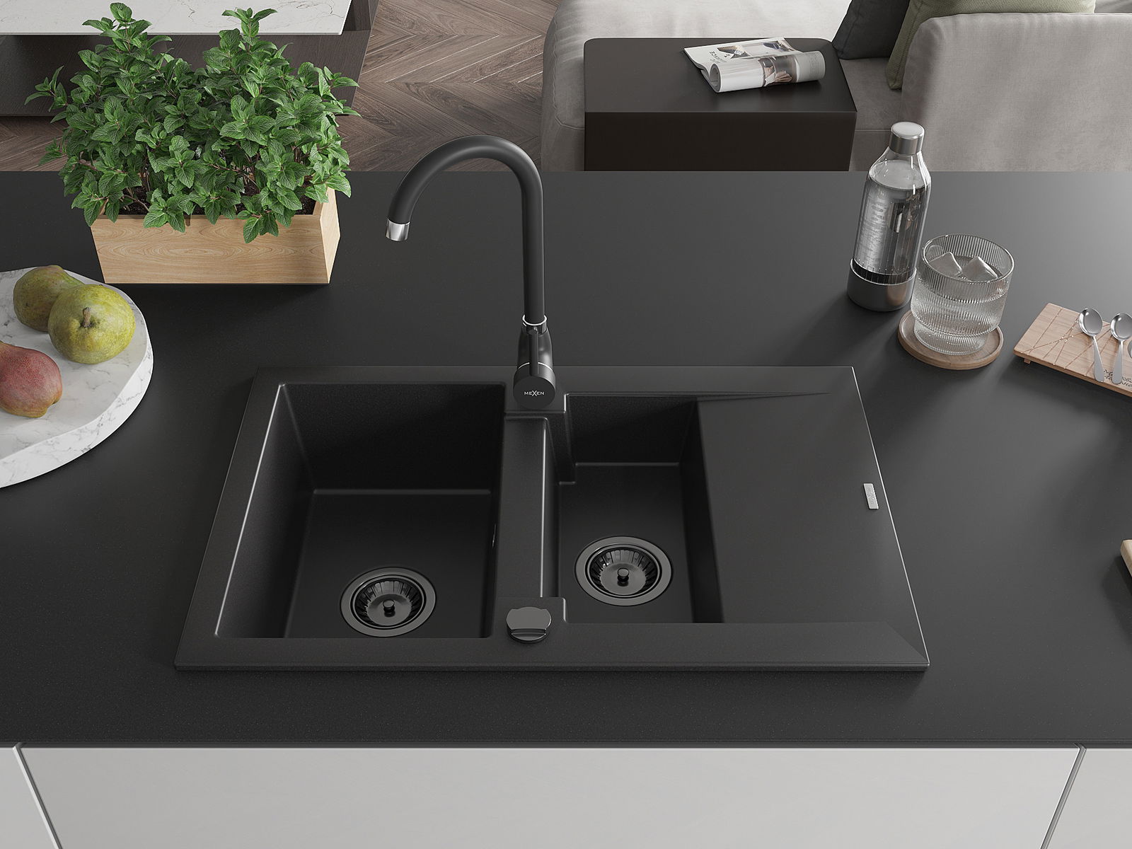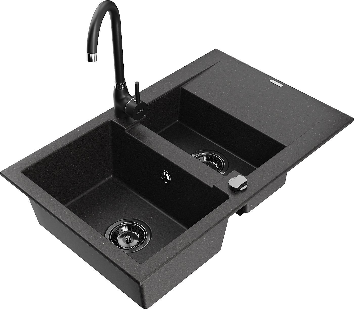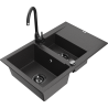 Mexen Gaspar lavello in granito 1,5 vasca con scolapiatti e rubinetto da cucina Telma, nero - 6507-77-670200-70-B