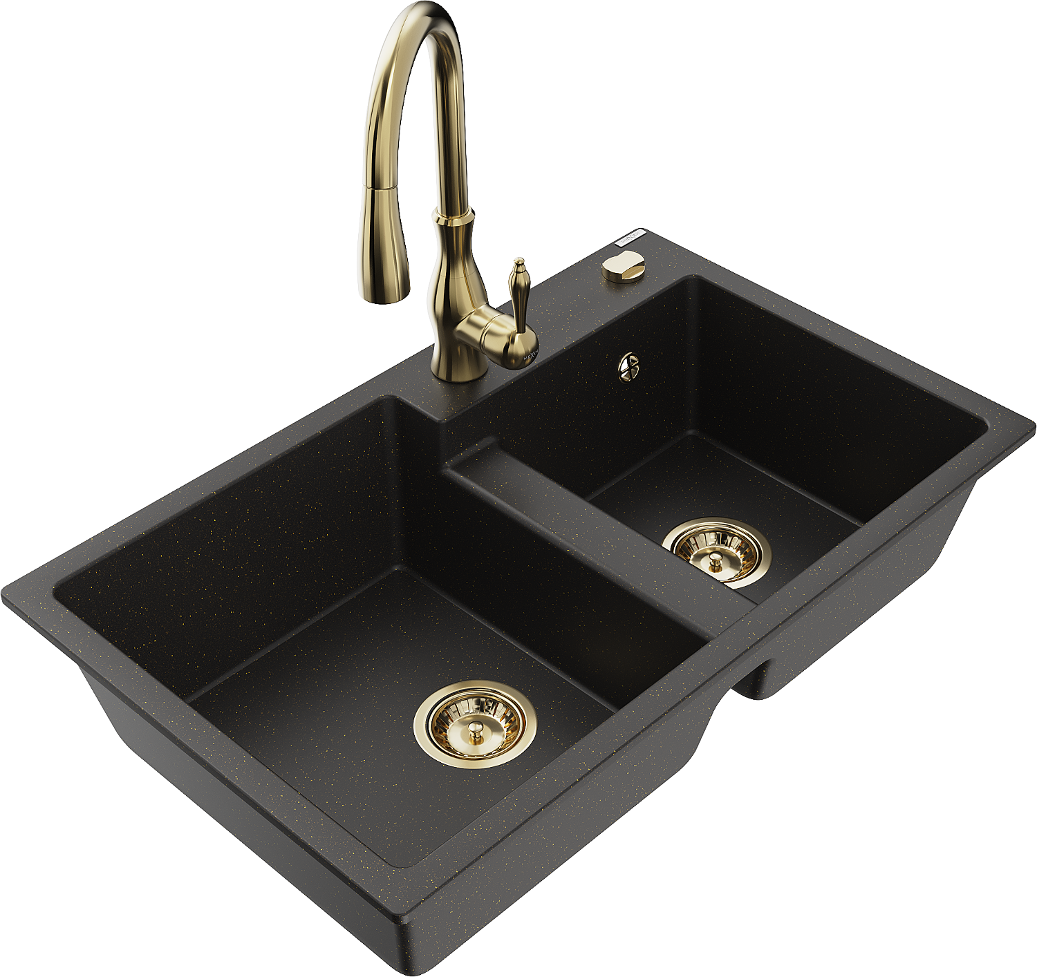 Mexen Tomas lavello da cucina in granito a 2 vasche con rubinetto cucina Savita, nero/oro metallizzato - 6516-75-672601-50
