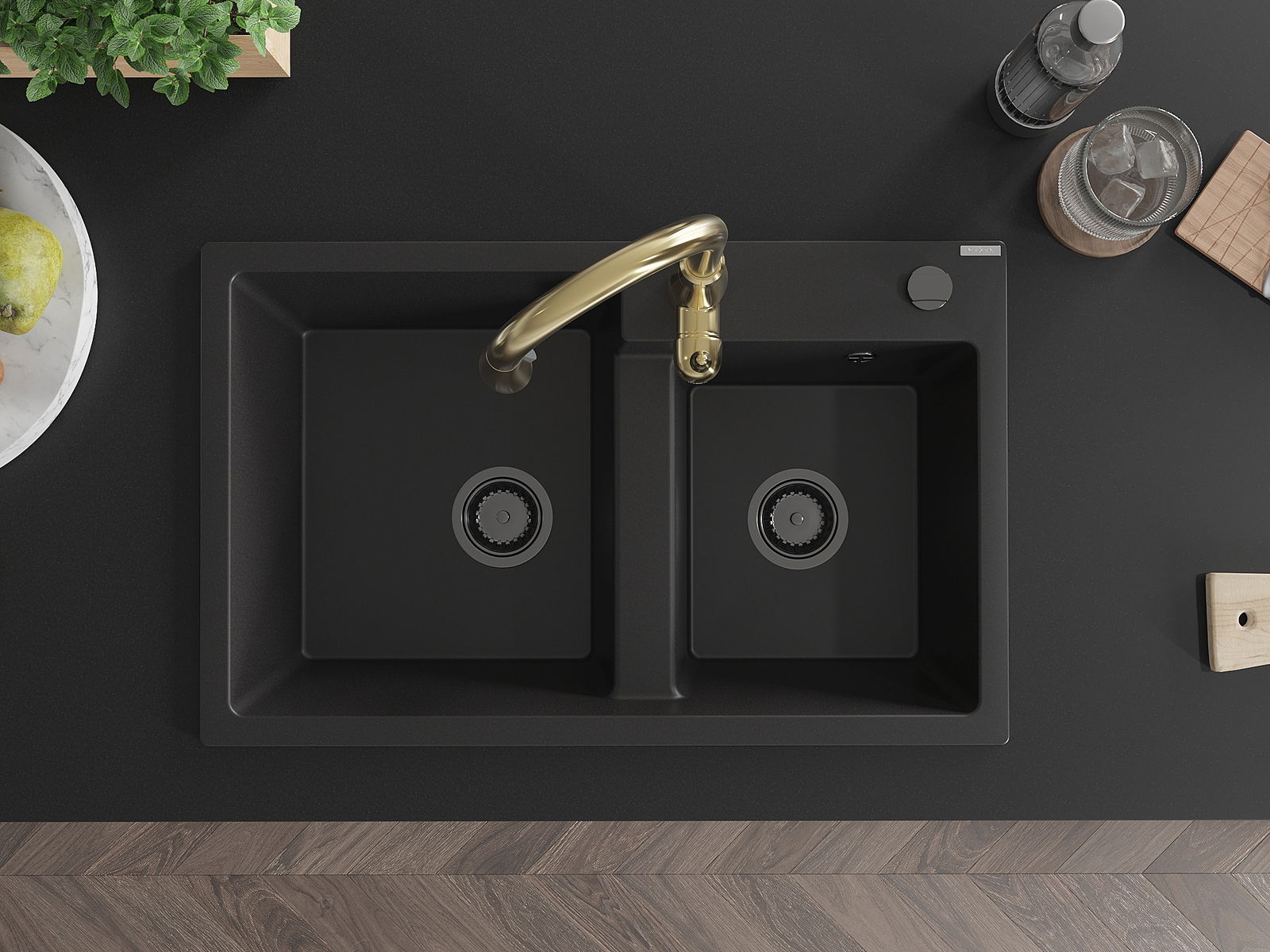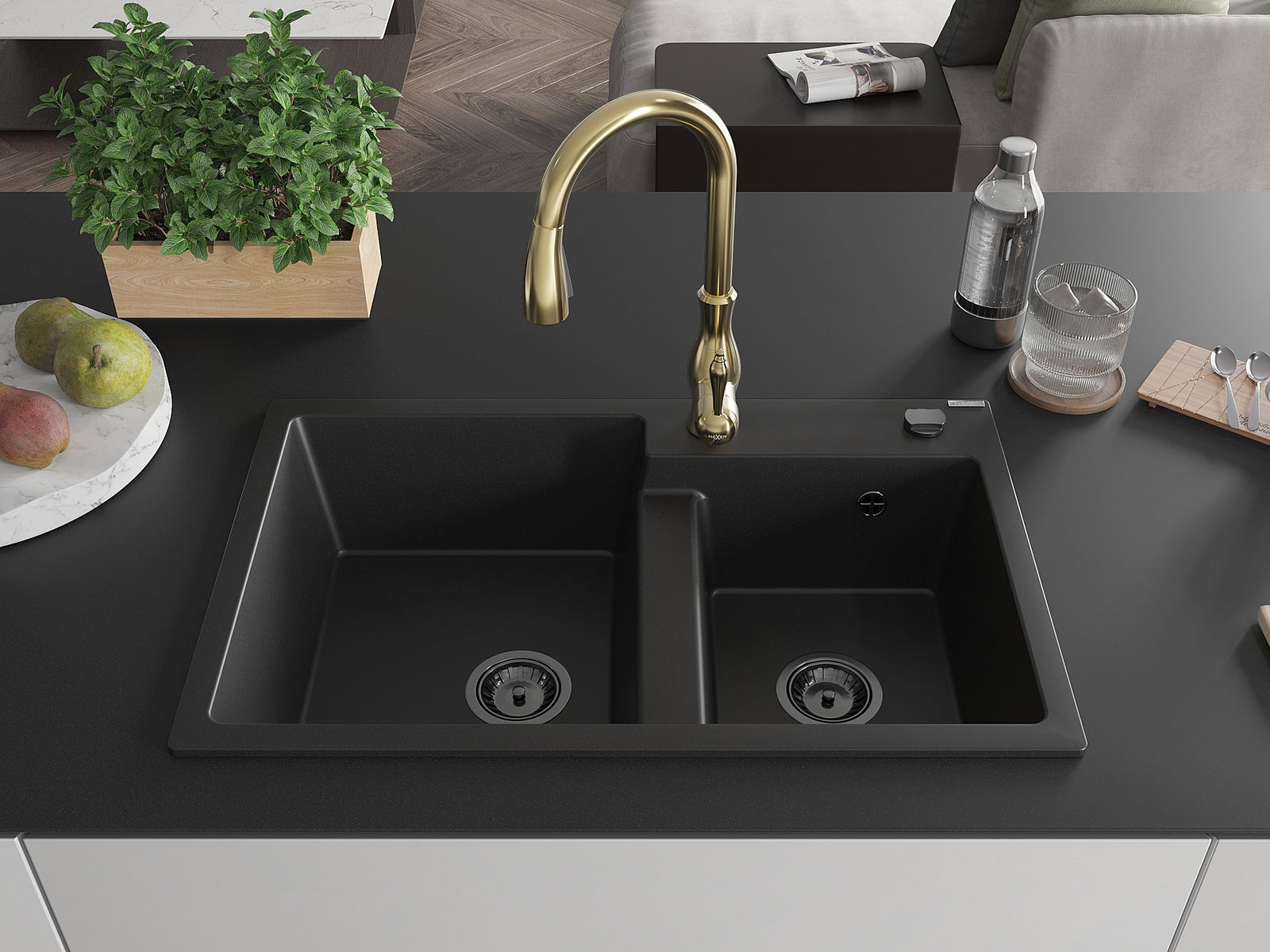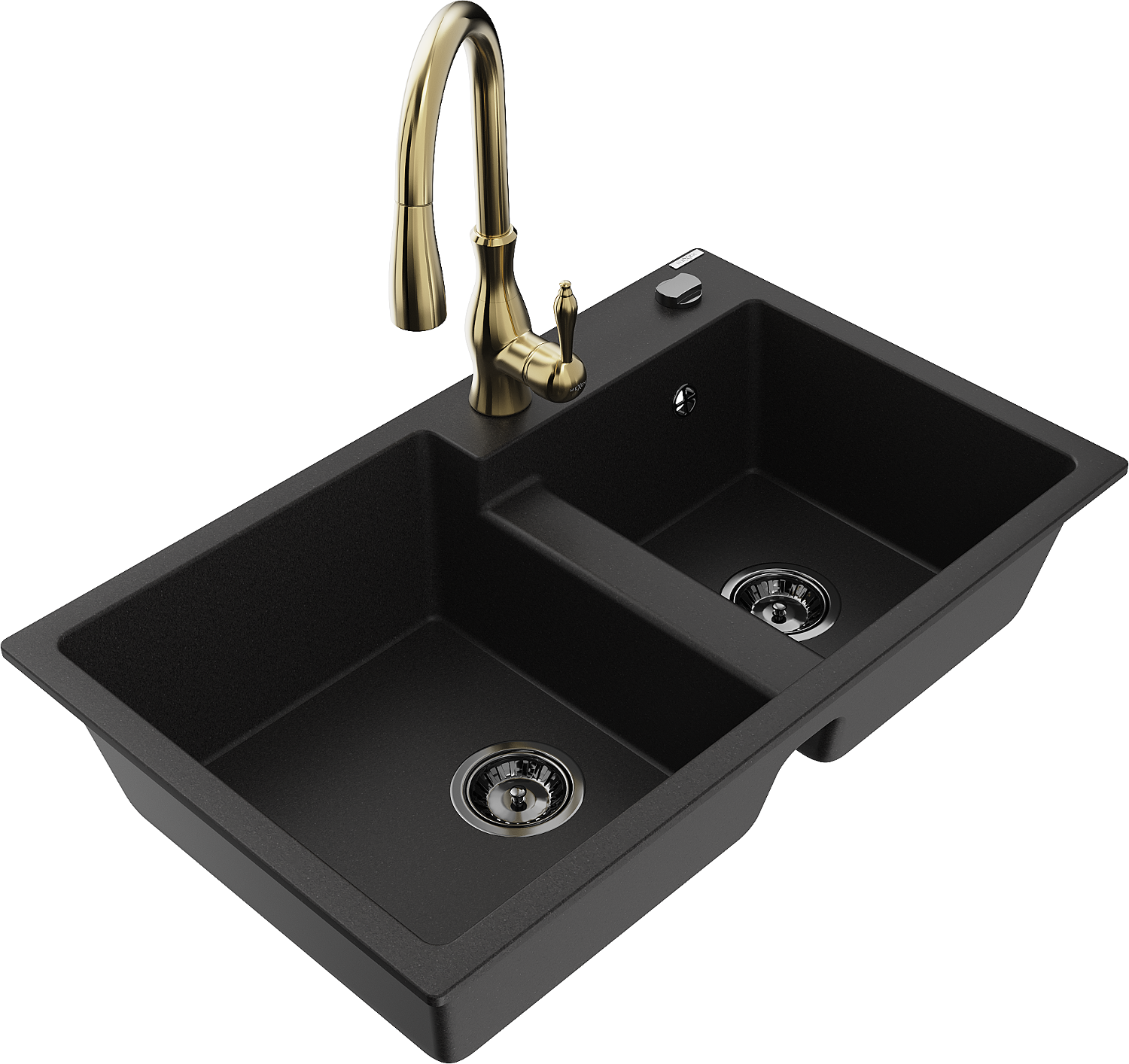 Mexen Tomas lavello in granito a 2 vasche con rubinetto da cucina Savita, nero - 6516-77-672601-50-B