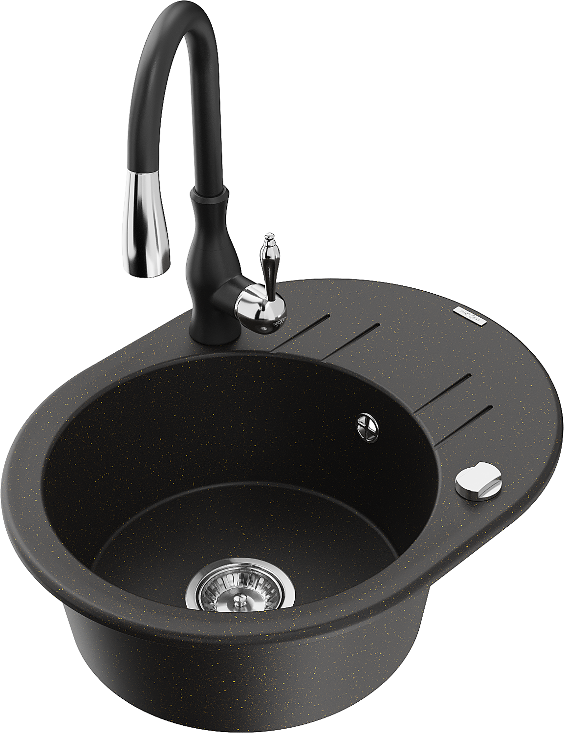 Mexen Kevin lavello in granito a una vasca con scolapiatti e rubinetto da cucina Savita, nero/oro metallizzato