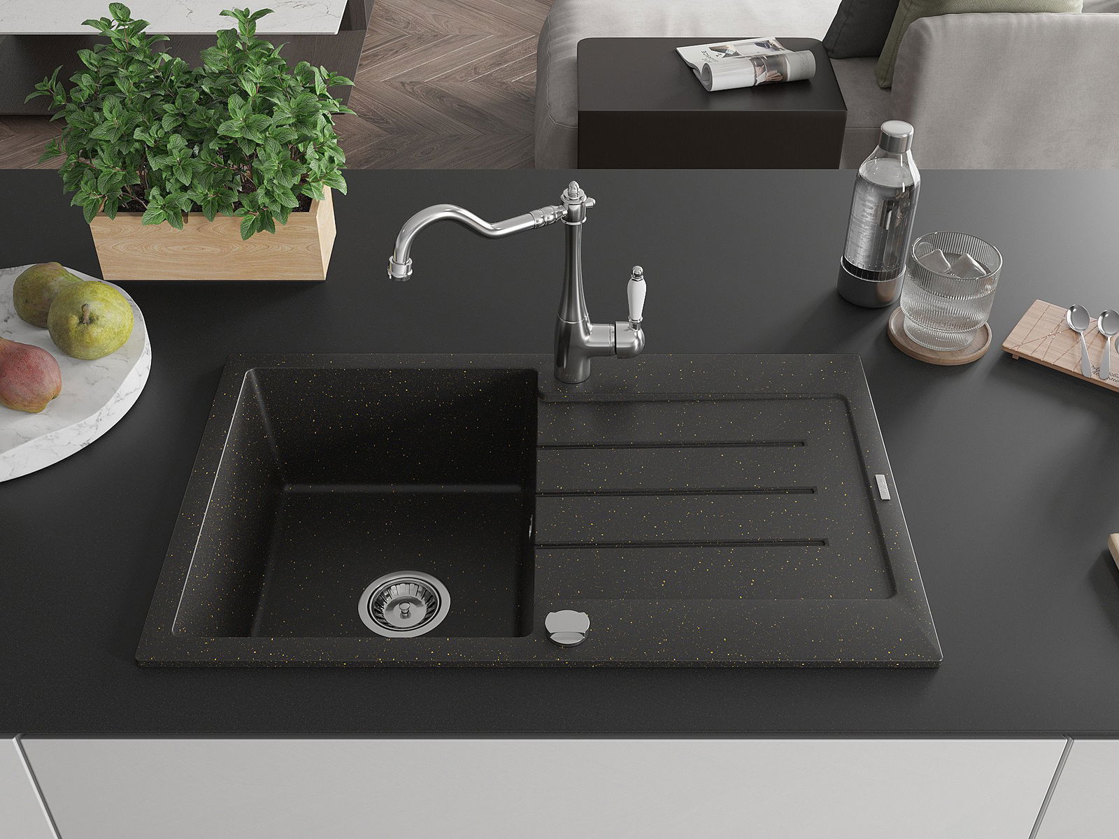 Mexen Bruno lavello in granito a 1 vasca con sgocciolatoio e rubinetto da cucina Carla, nero/oro metallico - 6513-75-670700-00