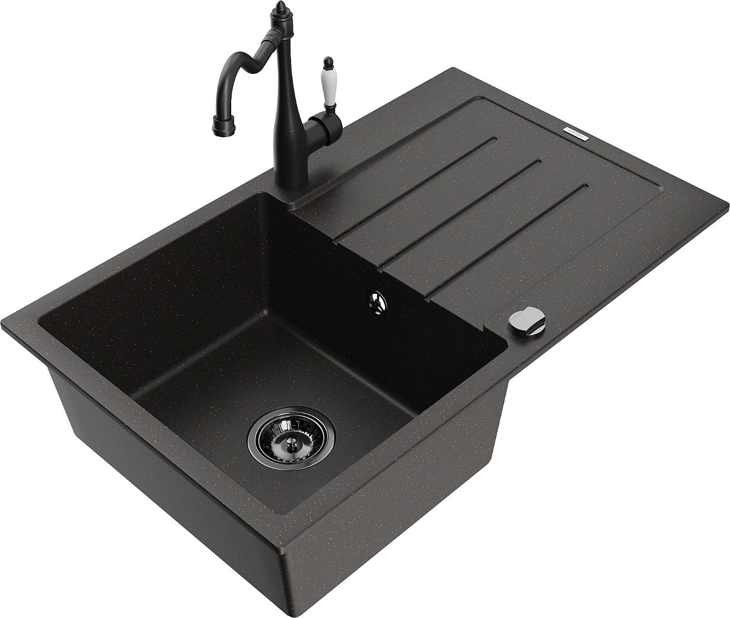 Mexen Bruno lavello in granito 1-vasca con scolapiatti e rubinetto cucina Carla, nero/oro metallizzato - 6513-75-670700-70-B