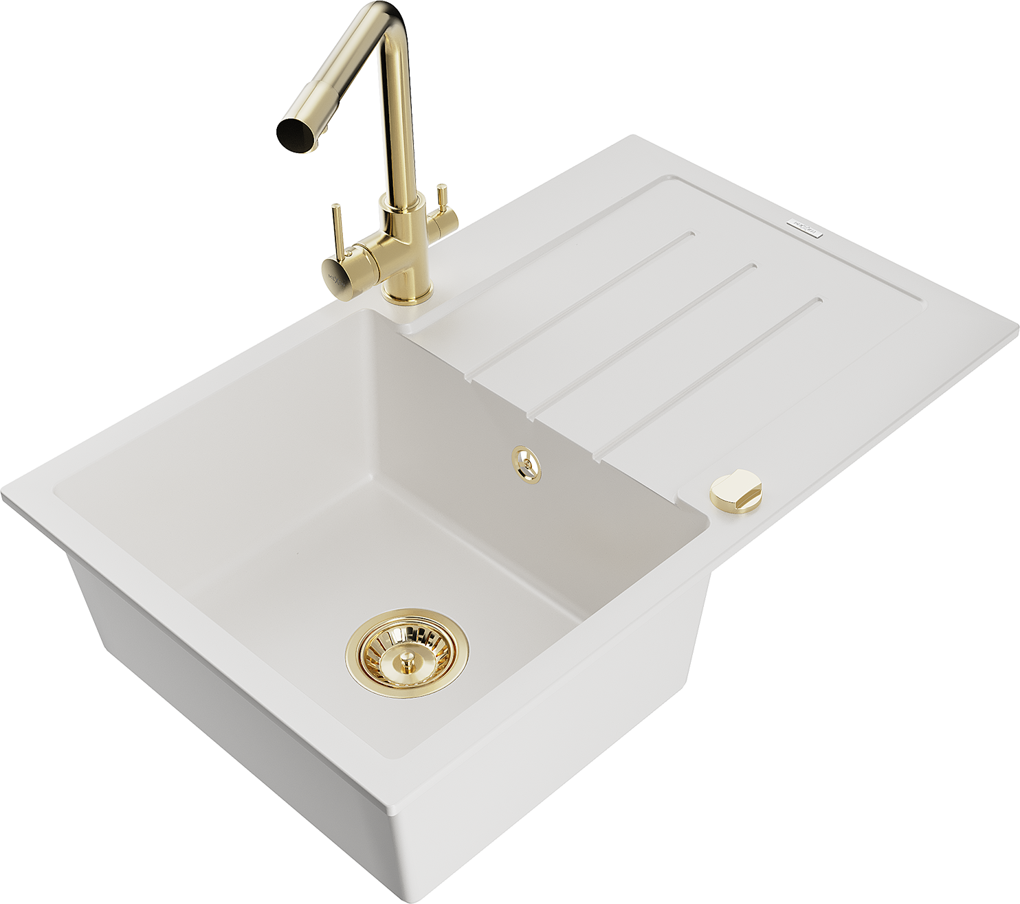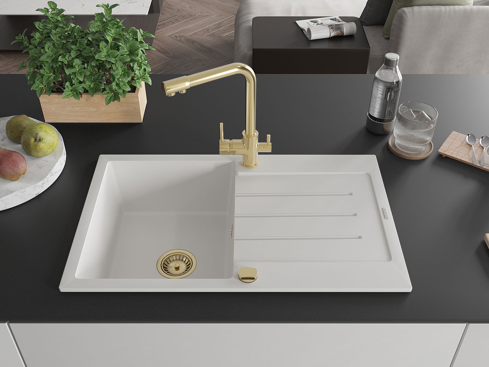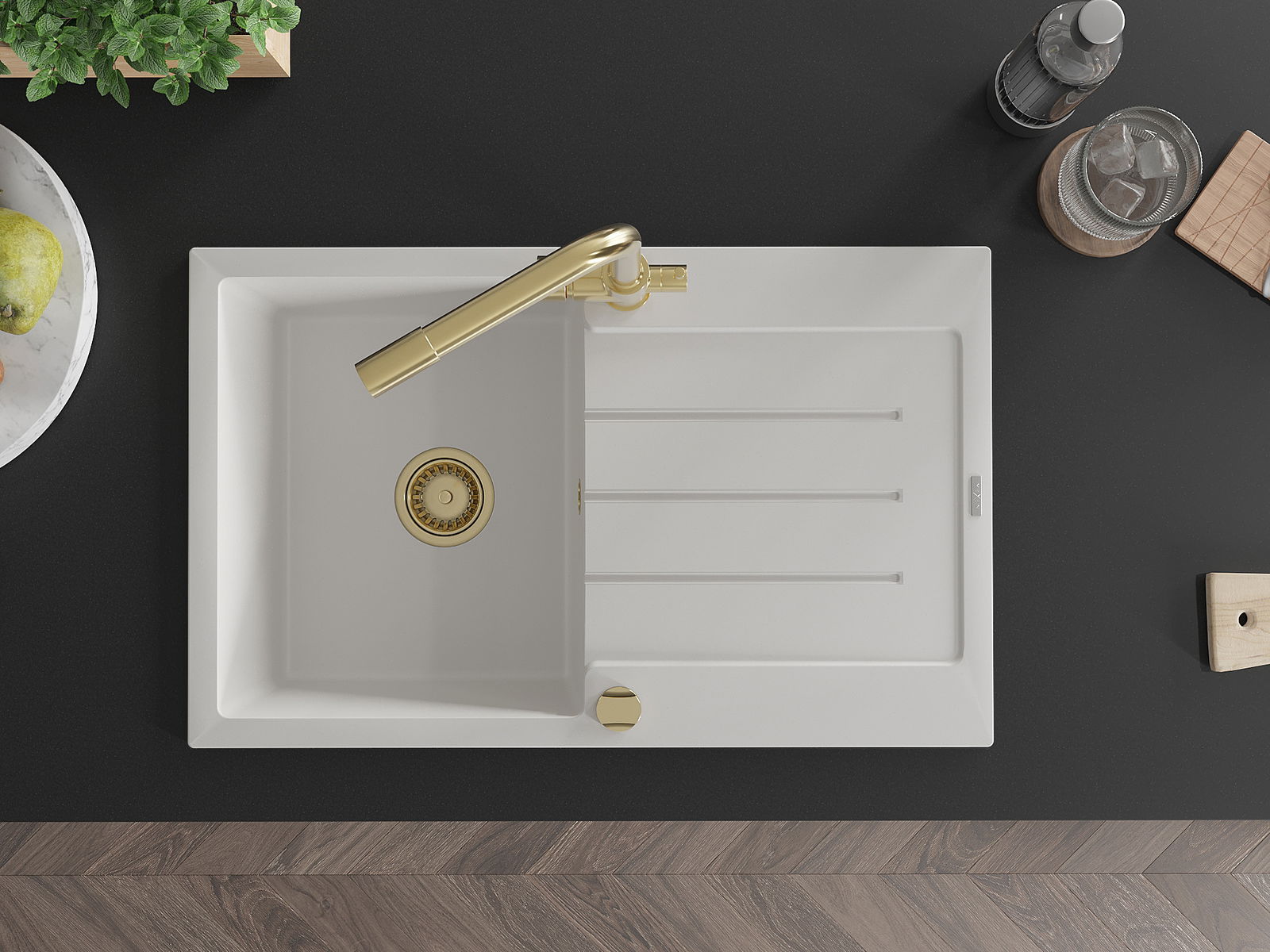 Mexen Bruno lavello in granito 1-vasca con sgocciolatoio e rubinetto da cucina Duero, bianco - 6513-20-671600-50