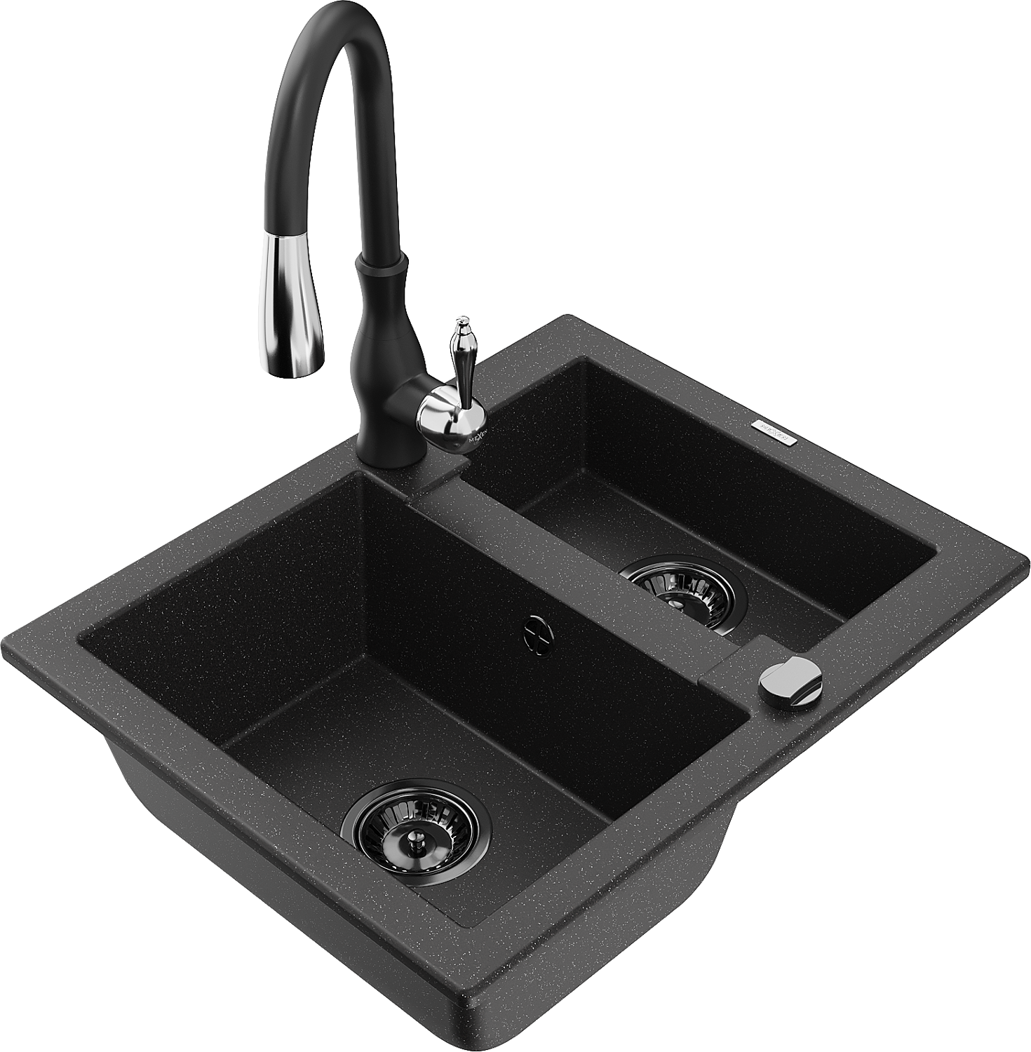 Mexen Carlos lavello in granito 1,5 vasche con rubinetto da cucina Savita, nero/metallo argento - 6518-73-672601-70-B