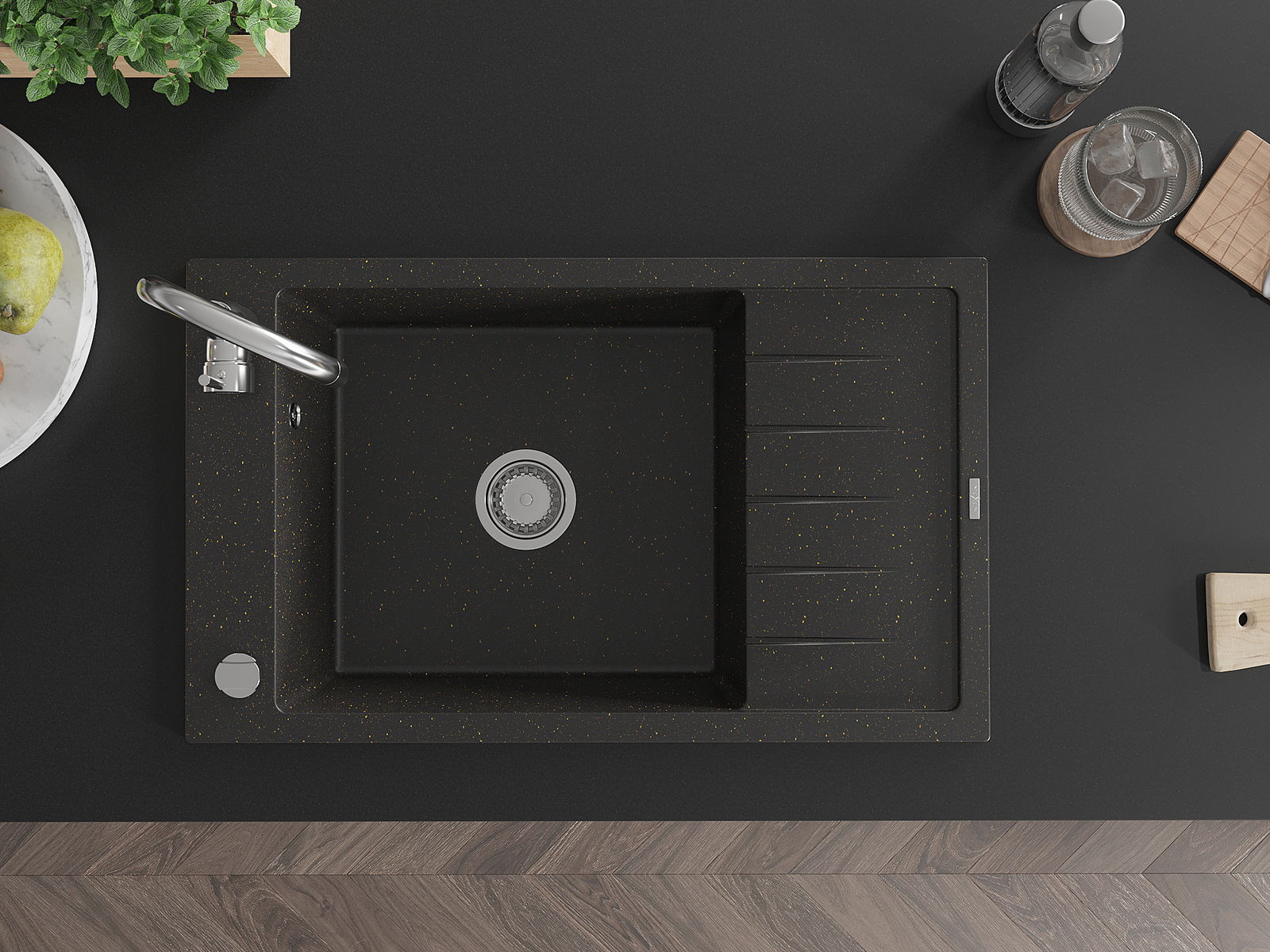 Mexen Elias lavello da cucina in granito a 1 vasca con scolapiatti e rubinetto Telma, nero/oro - 6511-75-670200-00