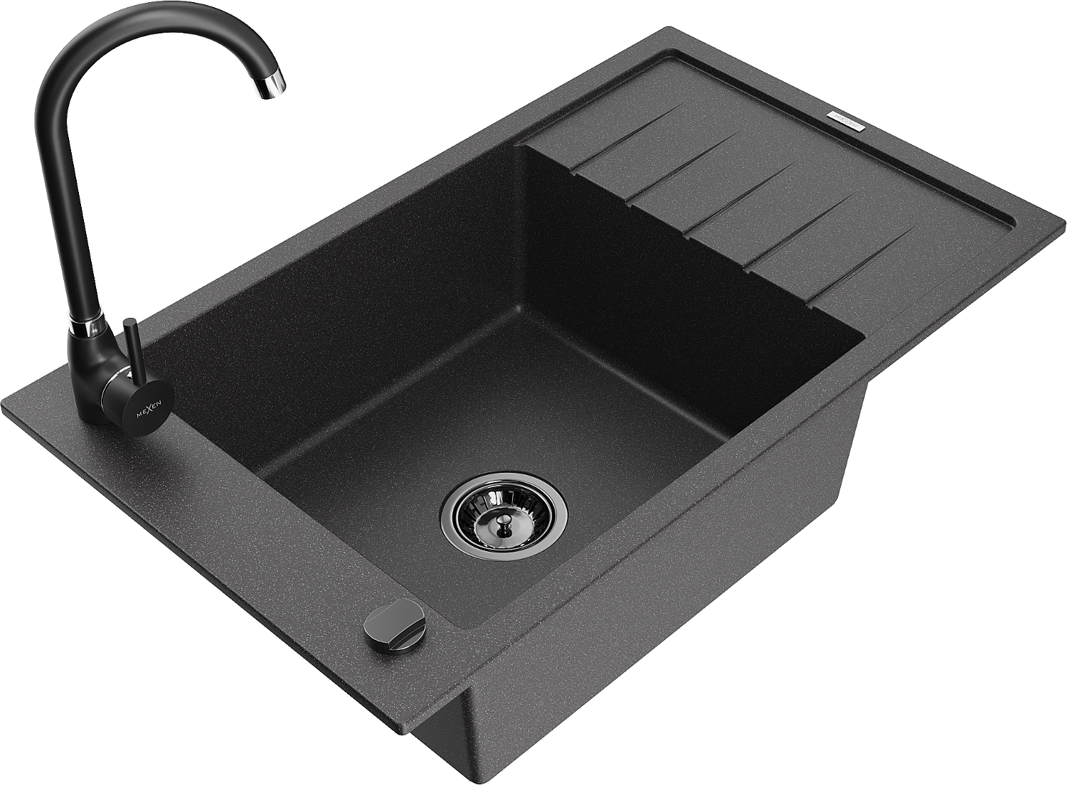 Mexen Elias lavello in granito a 1 vasca con sgocciolatoio e rubinetto da cucina Telma, nero maculato - 6511-76-670200-70-B
