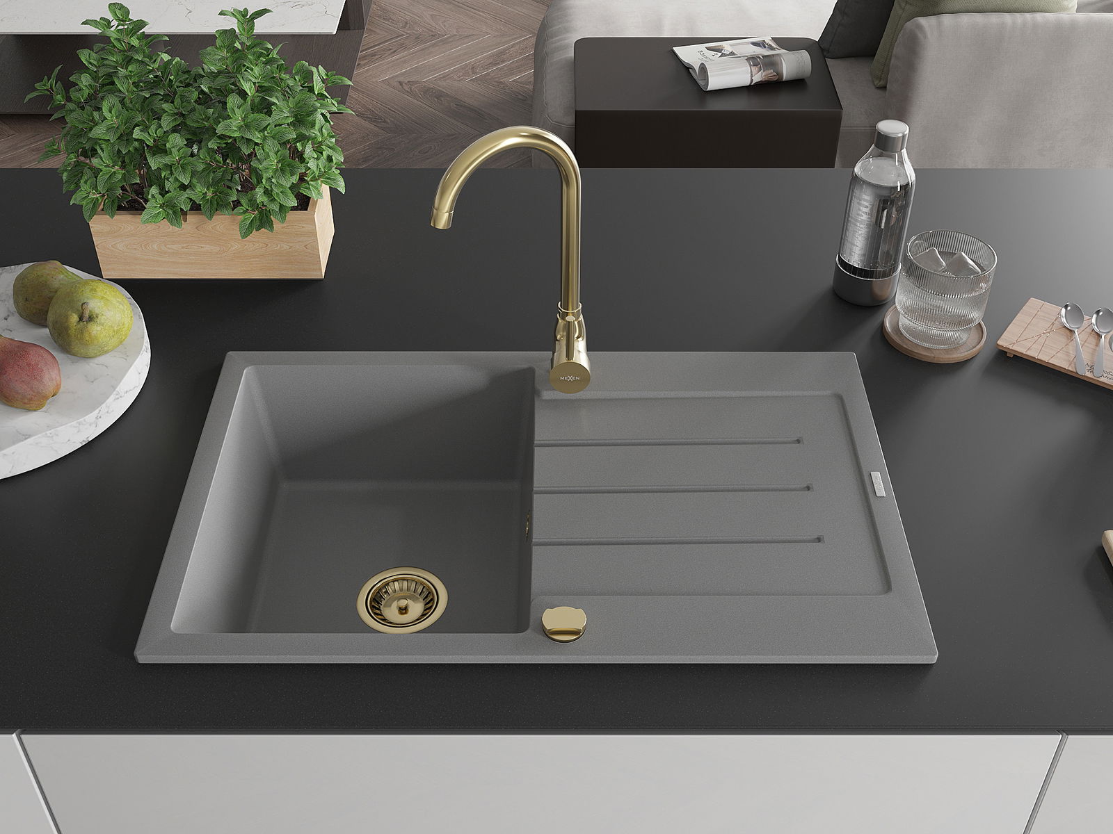 Mexen Bruno lavello in granito a 1 vasca con sgocciolatoio e rubinetto da cucina Telma, grigio - 6513-71-670200-50