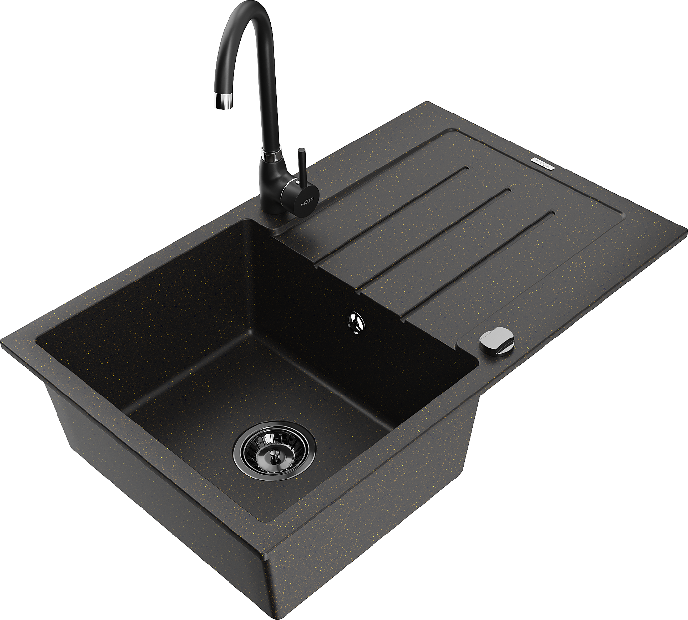 Mexen Bruno lavello in granito a 1 vasca con scolapiatti e rubinetto da cucina Telma, nero/oro - 6513-75-670200-70-B