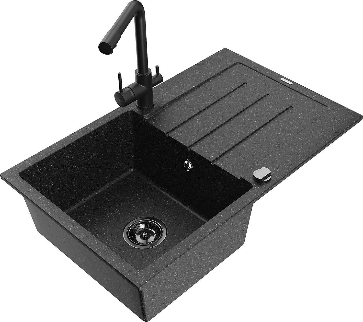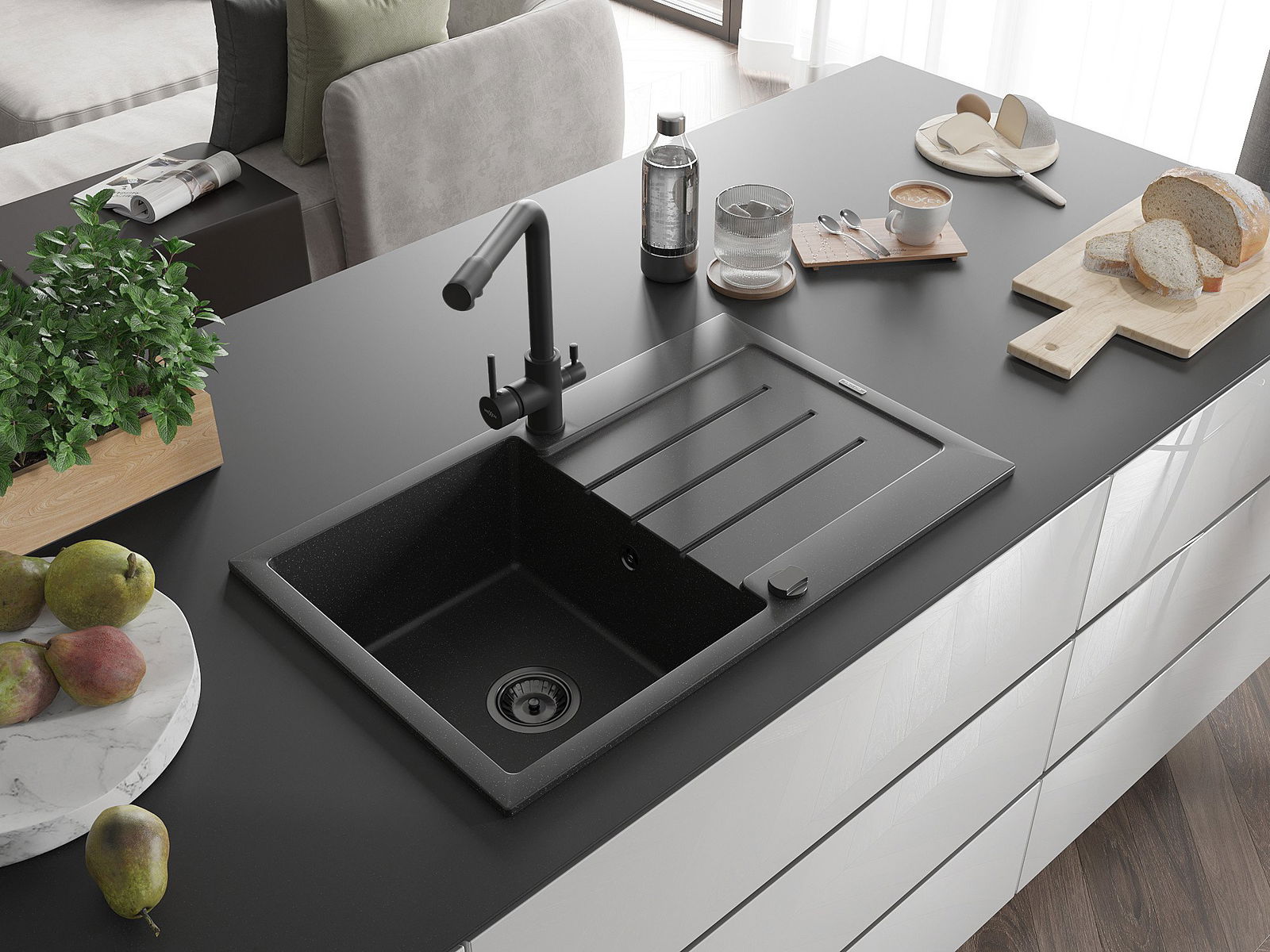 Mexen Bruno lavello in granito a 1 vasca con gocciolatoio e rubinetto da cucina Duero, nero/metallo argentato