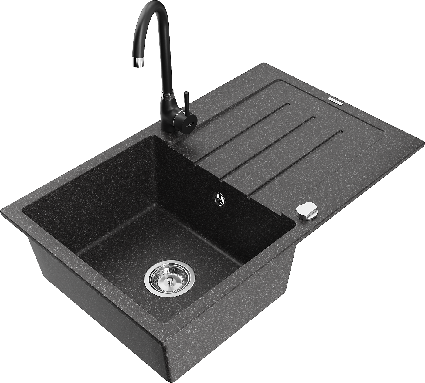 Mexen Bruno lavello in granito a 1 vasca con gocciolatoio e rubinetto da cucina Telma, nero maculato - 6513-76-670200-70