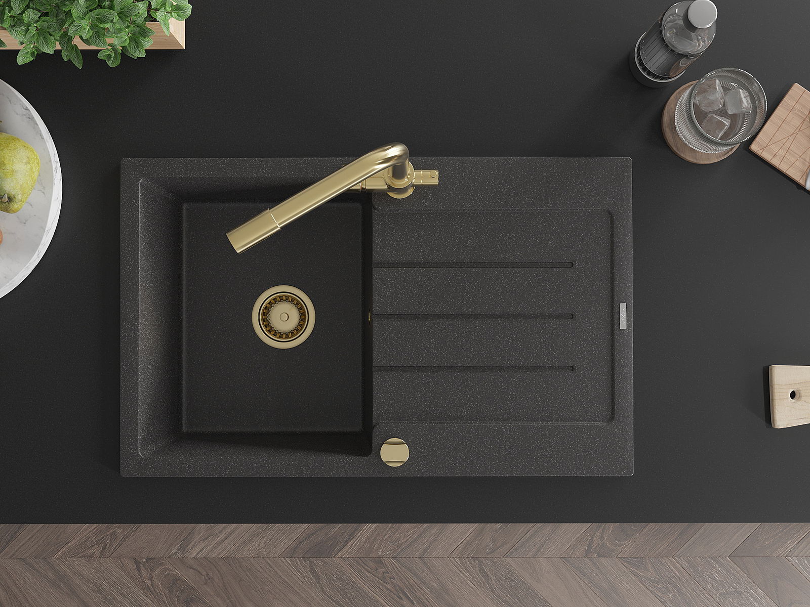 Mexen Bruno lavello in granito 1-vasca con sgocciolatoio e rubinetto cucina Duero, nero maculato - 6513-76-671600-50