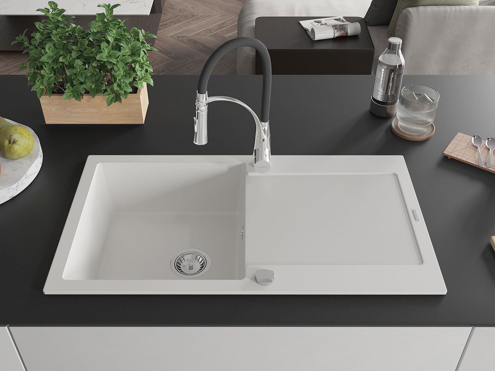 Mexen Leo lavello in granito 1-vasca con scolapiatti e miscelatore da cucina Aster, bianco - 6501-20-73450-07