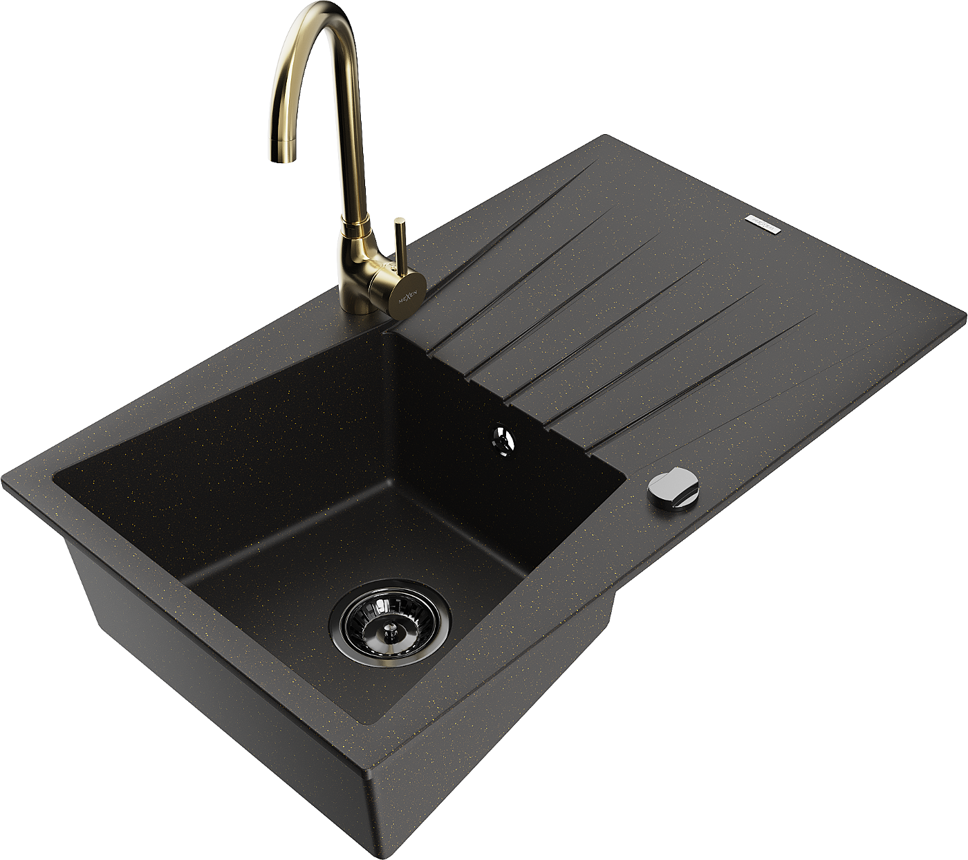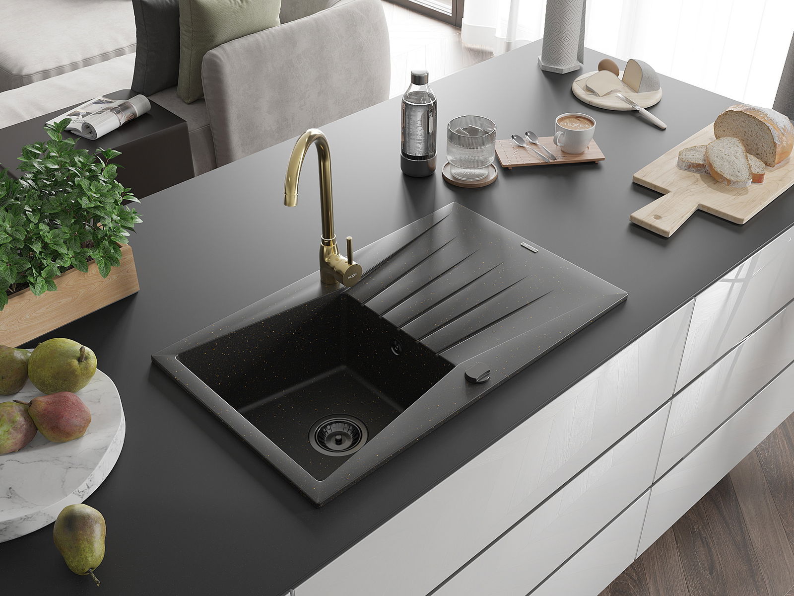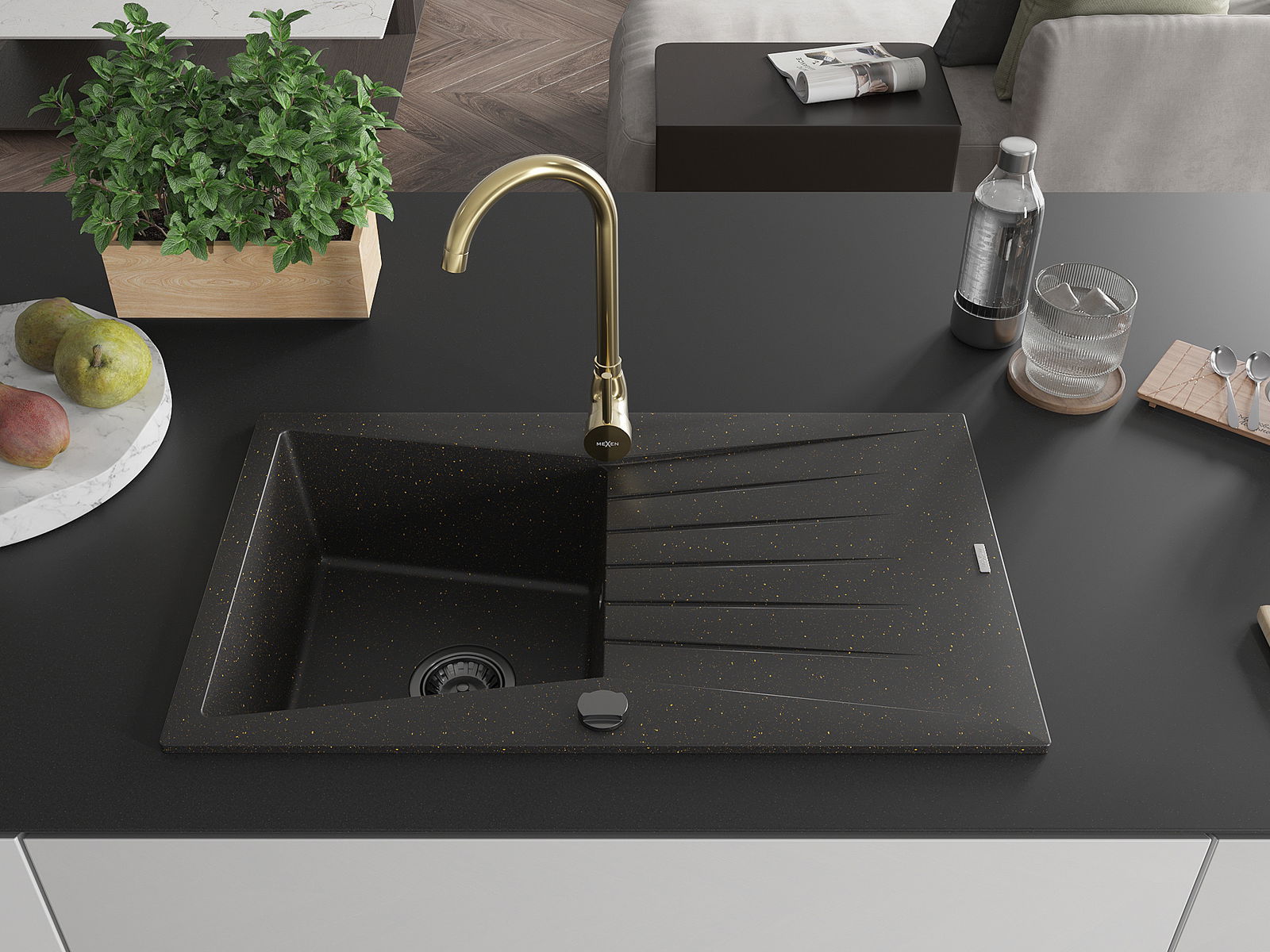 Mexen Cesar lavello in granito a 1 vasca con sgocciolatoio e rubinetto da cucina Telma, nero/oro - 6514-75-670200-50-B