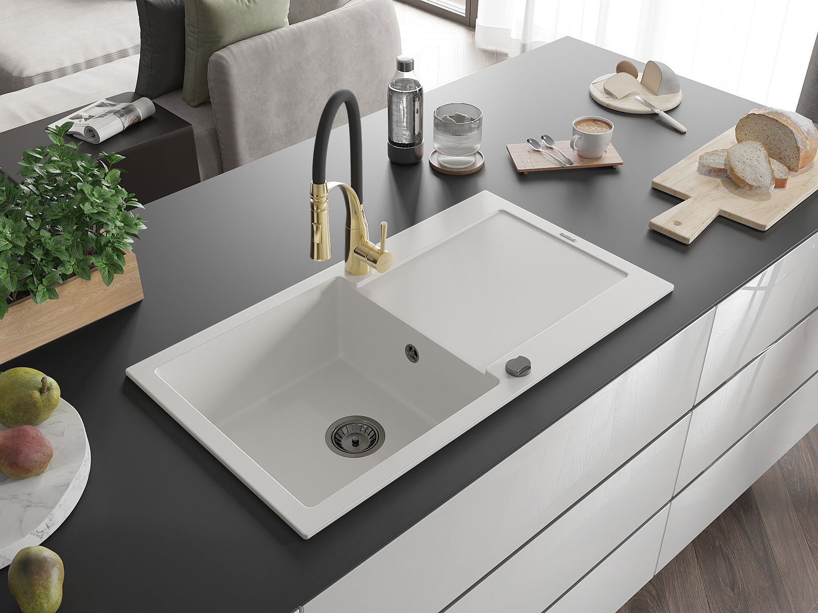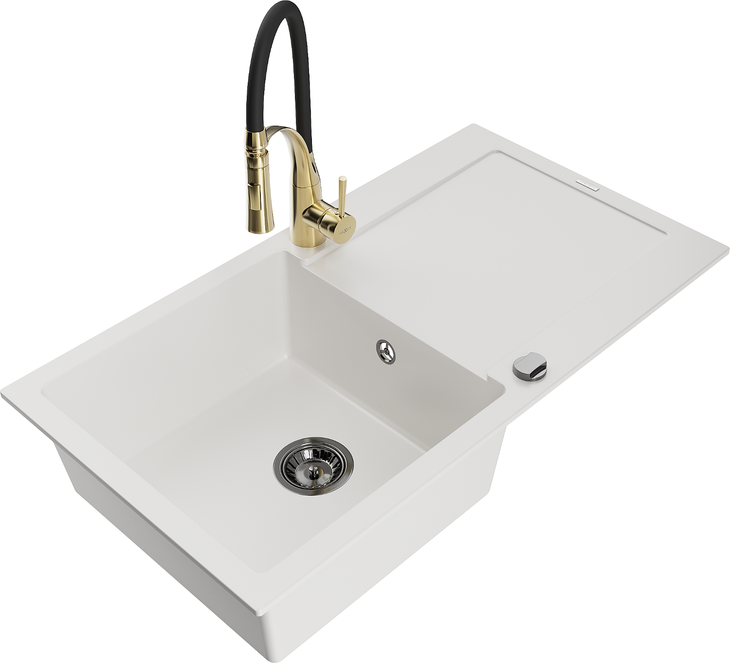 Mexen Leo lavello in granito a 1 vasca con sgocciolatoio e rubinetto da cucina Aster, bianco - 6501-20-73450-57-B