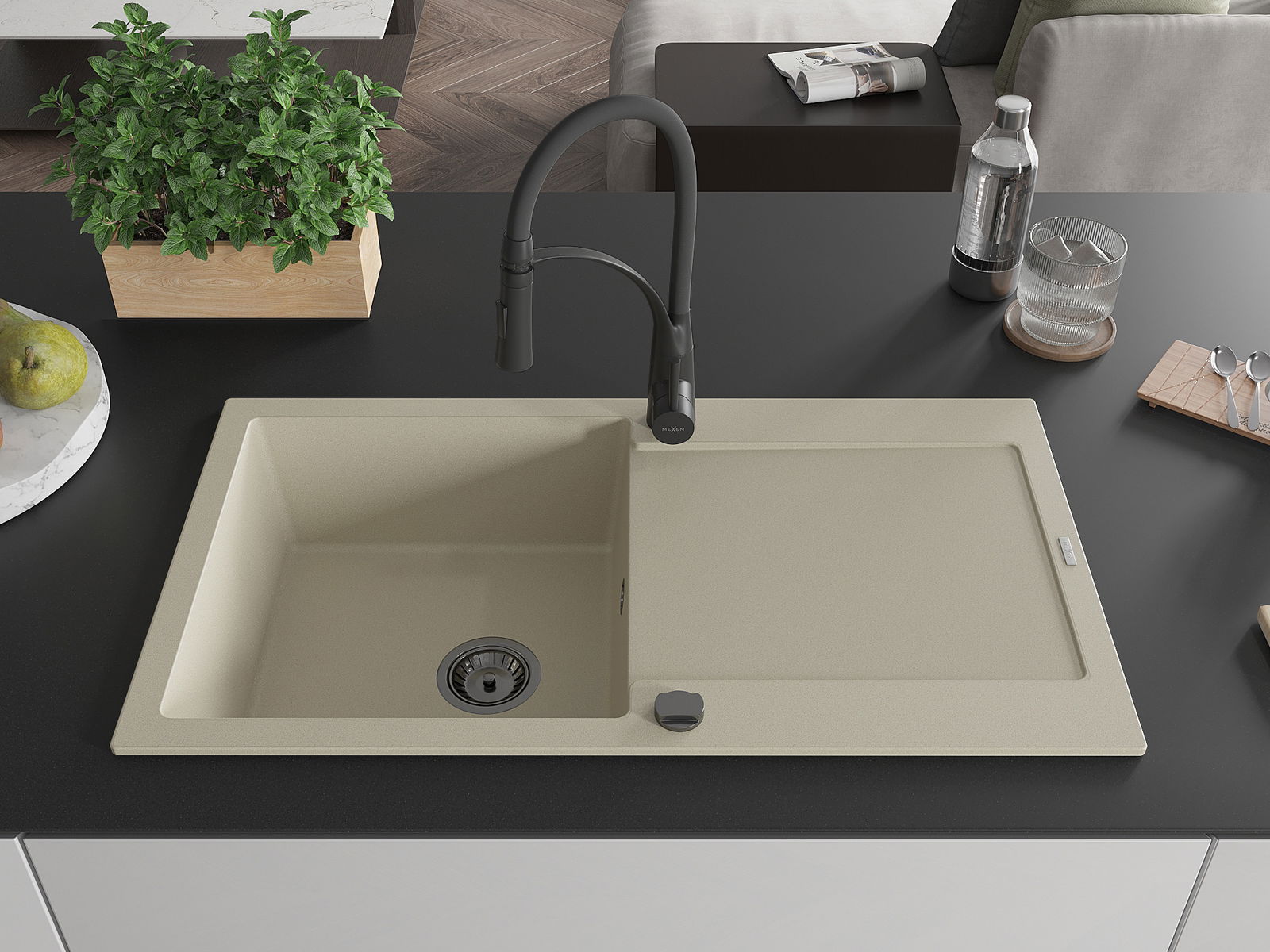 Mexen Leo lavello in granito 1-vasca con sgocciolatoio e batteria da cucina Aster, beige - 6501-69-73450-70-B