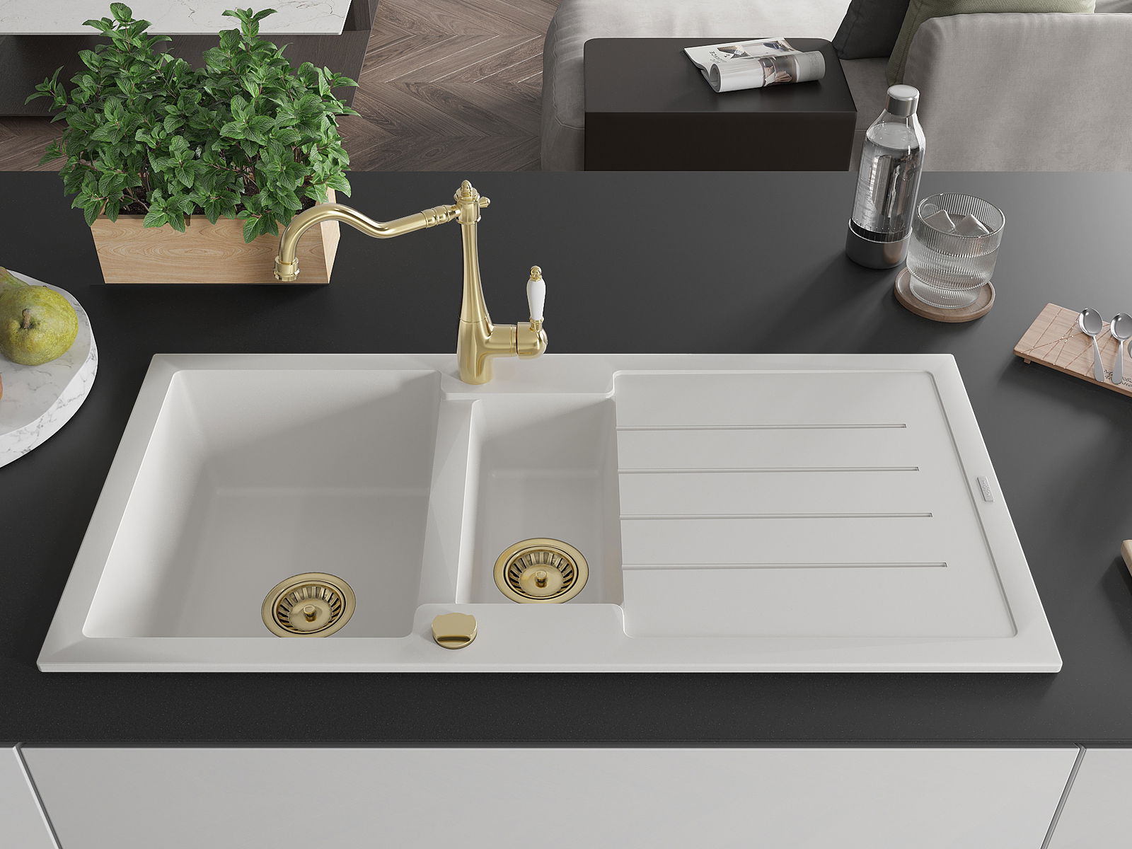 Mexen Andres lavello in granito 1,5 vasche con scolapiatti e rubinetto da cucina Carla, bianco - 6515-20-670700-50