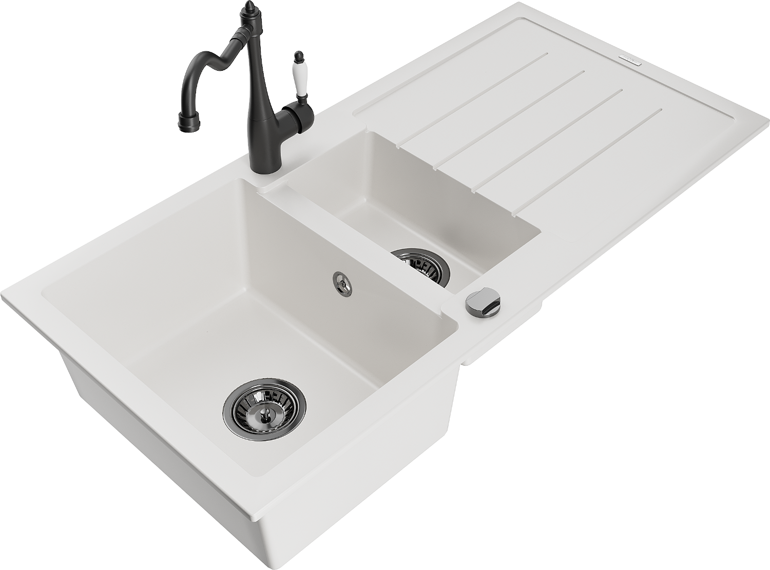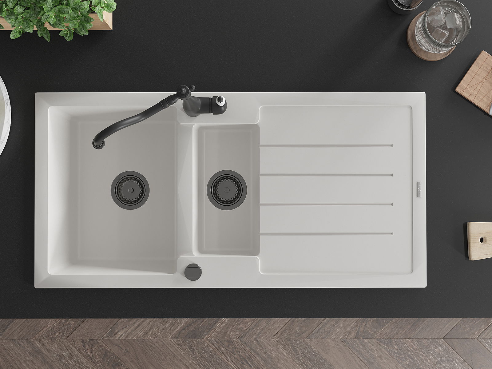 Mexen Andres lavello in granito 1,5 vasche con sgocciolatoio e miscelatore da cucina Carla, bianco - 6515-20-670700-70