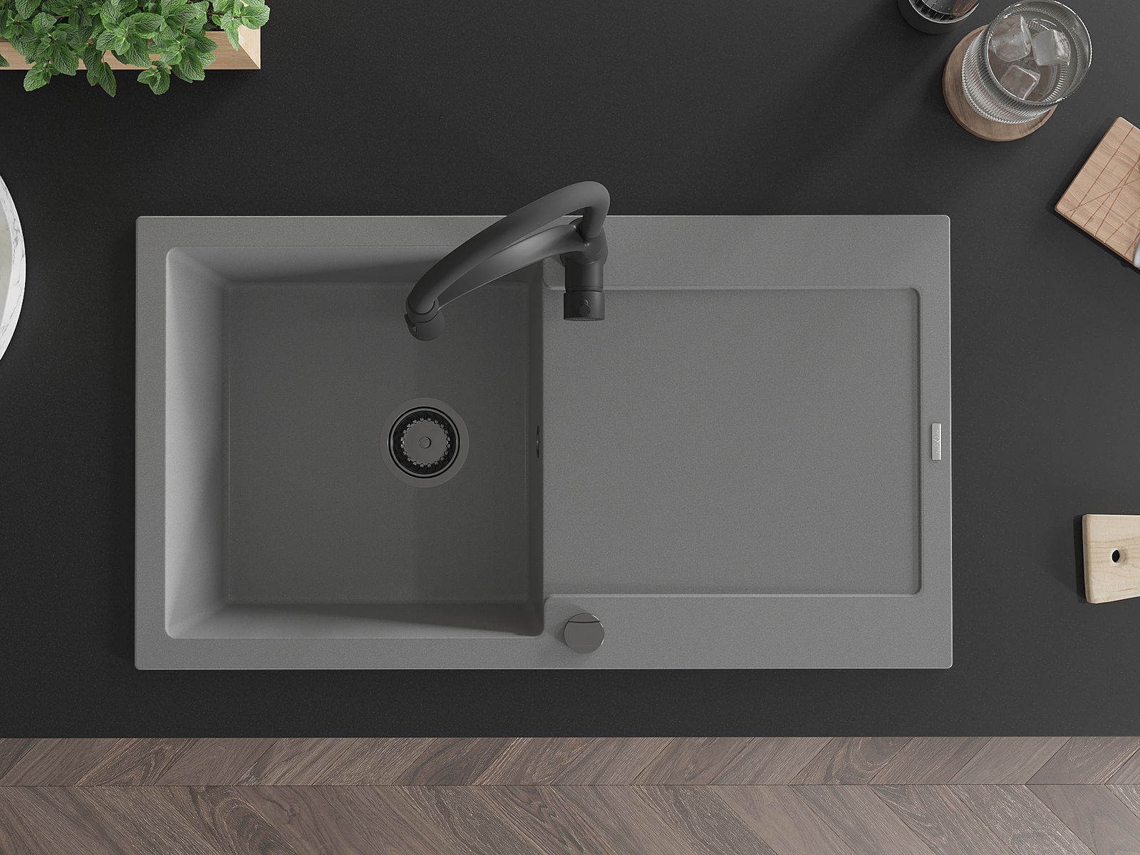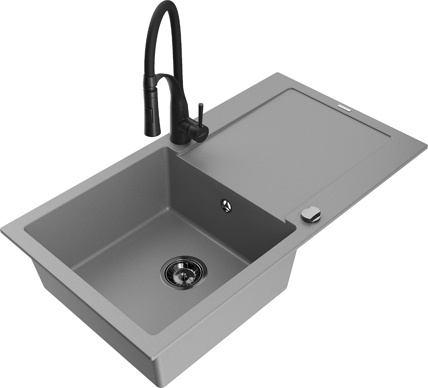 Mexen Leo lavello in granito 1-vasca con sgocciolatoio e rubinetto da cucina Aster, grigio - 6501-71-73450-70-B