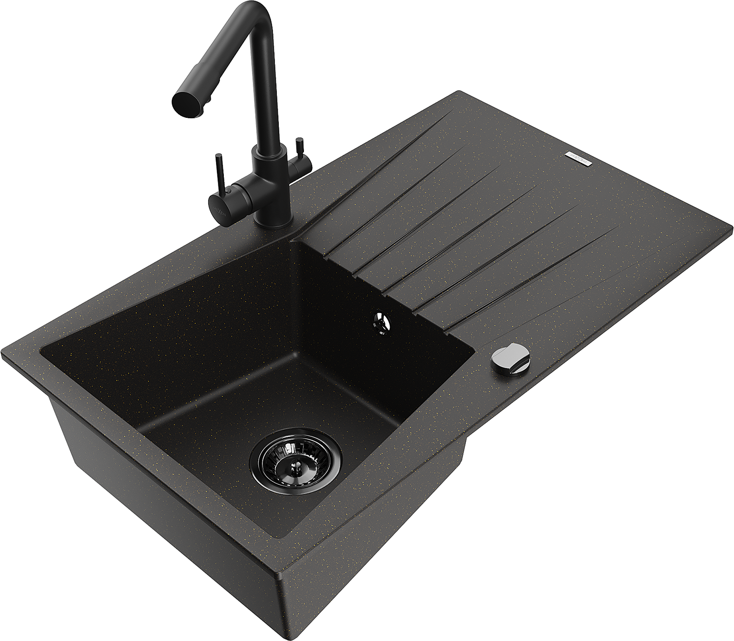 Mexen Cesar lavello in granito a 1 vasca con scolapiatti e rubinetto da cucina Duero, nero/oro metallizzato